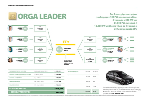 %u0393%u03b9%u03b1 3 %u03c3%u03c5%u03bd%u03b5%u03c7%u03cc%u03bc%u03b5%u03bd%u03bf%u03c5%u03c2 %u03bc%u03ae%u03bd%u03b5%u03c2 %u03c4%u03bf%u03c5%u03bb%u03ac%u03c7%u03b9%u03c3%u03c4%u03bf%u03bd 150 PW %u03c0%u03c1%u03bf%u03c3%u03c9%u03c0%u03b9%u03ba%u03cc %u03c4%u03b6%u03af%u03c1%u03bf,6 %u03b3%u03c1%u03b1%u03bc%u03bc%u03ad%u03c2 x 500 PW %u03ba%u03b1%u03b9%u00a0%u00a0%u00a0%u00a0%u00a024.000 PW %u03c3%u03c5%u03bd%u03bf%u03bb%u03b9%u03ba%u03ac %u03ae12.000 PW %u03c5%u03c0%u03cc%u03bb%u03bf%u03b9%u03c0%u03bf %u03c4%u03b6%u03af%u03c1%u03bf %u03c3%u03b5 1 %u03b3%u03c1%u03b1%u03bc%u03bc%u03ae x 21% %u03ae 2 %u03b3%u03c1%u03b1%u03bc%u03bc%u03ad%u03c2 21%LR Health & Beauty %u0395%u03c0%u03b9%u03c3%u03ba%u03cc%u03c0%u03b7%u03c3%u03b7 %u03ba%u03b1%u03c1%u03b9%u03ad%u03c1%u03b1%u03c2%u039a%u0395%u03a1%u0394%u039f%u03a3 %u0391%u03a0%u039f %u03a4%u0399%u03a3 %u0391%u0393%u039f%u03a1%u0395%u03a3 %u03c0%u03b5%u03c1%u03af%u03c0%u03bf%u03c5 40 % %u03c3%u03c4%u03b1 500 %u20ac = 200,00 %u20acBONUS %u03a3%u03a4%u039f%u039d %u03a0%u03a1%u039f%u03a3%u03a9%u03a0%u0399%u039a%u039f %u03a4%u0396%u0399%u03a1%u039f 21 % %u03c3%u03c4%u03b1 500 %u20ac = 105,00 %u20acBONUS %u0394%u0399%u0391%u03a6%u039f%u03a1%u0391%u03a3 %u03c0%u03c1%u03bf%u03c3%u03c4%u03af%u03b8%u03b5%u03c4%u03b1%u03b9 = 747,50 %u20acLEADER BONUS 3 % %u03c3%u03c4%u03b1 10.750 %u20ac = 322,50 %u20ac%u0395%u0399%u0394%u0399%u039a%u039f BONUS 7 % %u03c3%u03c4%u03b1 10.000 %u20ac = 700,00 %u20ac%u03a3%u03a5%u039d%u039f%u039b%u0399%u039a%u039f %u039a%u0395%u03a1%u0394%u039f%u03a3 2.075,00 %u20ac+ BONUS %u0391%u03a5%u03a4%u039f%u039a%u0399%u039d%u0397%u03a4%u039f%u03a5 3 480,00 %u20ac%u0395%u0399%u0394%u0399%u039a%u039f BONUS 2 10 x 21% 9 %u2013 10 %7 x 21% 8,5 %4 x 21% 8 %2 x 21% 7,5 %1 x 21% 7 %%u03a9%u03c2 Leader, %u03bb%u03b1%u03bc%u03b2%u03ac%u03bd%u03b5%u03b9%u03c2 %u03c5%u03c8%u03b7%u03bb%u03cc%u03c4%u03b5%u03c1%u03bf bonus %u03b1%u03c5%u03c4%u03bf%u03ba%u03b9%u03bd%u03ae%u03c4%u03bf%u03c5 %u03ba%u03b1%u03b9 %u03b5%u03c0%u03b9%u03bb%u03ad%u03b3%u03b5%u03b9%u03c2 %u03ba%u03ac%u03c0%u03bf%u03b9%u03bf %u03b1%u03c0%u03cc %u03c4%u03b1 %u03bc%u03bf%u03bd%u03c4%u03ad%u03bb%u03b1 Mercedes %u03c4%u03b7%u03c2 %u03b1%u03bd%u03c4%u03af%u03c3%u03c4%u03bf%u03b9%u03c7%u03b7%u03c2 %u03ba%u03b1%u03c4%u03b7%u03b3%u03bf%u03c1%u03af%u03b1%u03c2. %u039c%u03c0%u03bf%u03c1%u03b5%u03af%u03c2 %u03bd%u03b1 %u03b4%u03b5%u03b9%u03c2 %u03c4%u03b1 %u03c5%u03c0%u03cc%u03bb%u03bf%u03b9%u03c0%u03b1 %u03b4%u03b9%u03b1%u03b8%u03ad%u03c3%u03b9%u03bc%u03b1 %u03bc%u03bf%u03bd%u03c4%u03ad%u03bb%u03b1 %u03c3%u03c4%u03bf neo.lrworld.com%u0393%u03b9%u03b1 %u03bb%u03cc%u03b3%u03bf%u03c5%u03c2 %u03b1%u03c0%u03bb%u03bf%u03cd%u03c3%u03c4%u03b5%u03c5%u03c3%u03b7%u03c2 %u03b8%u03b5%u03c9%u03c1%u03bf%u03cd%u03bc%u03b5 %u03c3%u03b5 %u03cc%u03bb%u03b1 %u03c4%u03b1 %u03c0%u03b1%u03c1%u03b1%u03b4%u03b5%u03af%u03b3%u03bc%u03b1%u03c4%u03b1 %u03cc%u03c4%u03b9 1 %u20ac (%u03c7%u03c9%u03c1%u03af%u03c2 %u03a6%u03a0%u0391) = 2 PW.; 1 %u03c3%u03c5%u03bd%u03bf%u03bb%u03b9%u03ba%u03cc%u03c2 %u03c4%u03b6%u03af%u03c1%u03bf%u03c2; 2 %u0393%u03b9%u03b1 %u03c0%u03b5%u03c1%u03b9%u03c3%u03c3%u03cc%u03c4%u03b5%u03c1%u03b5%u03c2 %u03bb%u03b5%u03c0%u03c4%u03bf%u03bc%u03ad%u03c1%u03b5%u03b9%u03b5%u03c2 %u03c3%u03c7%u03b5%u03c4%u03b9%u03ba%u03ac %u03bc%u03b5 %u03c4%u03b1 %u03b4%u03b9%u03b1%u03c6%u03bf%u03c1%u03b5%u03c4%u03b9%u03ba%u03ac bonus, %u03b1%u03bd%u03ac%u03c4%u03c1%u03b5%u03be%u03b5 %u03c3%u03c4%u03bf LR Career Plan.; 3 %u0391%u03c0%u03b1%u03c1%u03b1%u03af%u03c4%u03b7%u03c4%u03b7 %u03c0%u03c1%u03bf%u03cb%u03c0%u03cc%u03b8%u03b5%u03c3%u03b7 %u03b3%u03b9%u03b1 %u03c4%u03b7%u03bd %u03b1%u03c0%u03bf%u03c0%u03bb%u03b7%u03c1%u03c9%u03bc%u03ae%u03bd %u03c4%u03bf%u03c5 bonus %u03b1%u03c5%u03c4%u03bf%u03ba%u03b9%u03bd%u03ae%u03c4%u03bf%u03c5 %u03b3%u03b9%u03b1 %u03c4%u03bf LR %u03b1%u03c5%u03c4%u03bf%u03ba%u03af%u03bd%u03b7%u03c4%u03cc %u03c3%u03bf%u03c5 %u03b5%u03af%u03bd%u03b1%u03b9 %u03b7 %u03c3%u03cd%u03bd%u03b1%u03c8%u03b7 %u03c3%u03c5%u03bc%u03c6%u03c9%u03bd%u03af%u03b1%u03c2 %u03bc%u03af%u03c3%u03b8%u03c9%u03c3%u03b7%u03c2 %u03bf%u03c7%u03ae%u03bc%u03b1%u03c4%u03bf%u03c2 %u03bc%u03b5 %u03c4%u03b7%u03bd %u03b1%u03bd%u03c4%u03af%u03c3%u03c4%u03bf%u03b9%u03c7%u03b7 %u03b5%u03c4%u03b1%u03b9%u03c1%u03b5%u03af%u03b1 %u03bc%u03af%u03c3%u03b8%u03c9%u03c3%u03b7%u03c2 (%u03b1%u03c0%u03b1%u03c1%u03b1%u03af%u03c4%u03b7%u03c4%u03b7 %u03c0%u03c1%u03bf%u03cb%u03c0%u03cc%u03b8%u03b5%u03c3%u03b7 %u03b1%u03c0%u03bf%u03c4%u03b5%u03bb%u03b5%u03af %u03b7 %u03b1%u03bd%u03c4%u03af%u03c3%u03c4%u03bf%u03b9%u03c7%u03b7 %u03c0%u03b9%u03c3%u03c4%u03bf%u03bb%u03b7%u03c0%u03c4%u03b9%u03ba%u03ae %u03b9%u03ba%u03b1%u03bd%u03cc%u03c4%u03b7%u03c4%u03b1).ORGA LEADER14%6%9%%u03a3%u03a4%u0395%u03a6%u0391%u039d%u039f%u03a36.000 PW 13.000 %u20ac 1%u0395%u039b%u0395%u039d%u0397500 PW 1250 %u20ac 1%u03a7%u0391%u03a1%u0397%u03a31.000 PW 1500 %u20ac 111% 16%%u0393%u0399%u0391%u039d%u039d%u0397%u03a3 & %u039c%u0391%u03a1%u0399%u03918.000 PW 14.000 %u20ac 1%u039c%u0391%u0399%u03a1%u03972.000 PW 11.000 %u20ac 17% %u03b4%u03b9%u03b1%u03c6%u03bf%u03c1%u03ac = 210 %u20ac15% %u03b4%u03b9%u03b1%u03c6%u03bf%u03c1%u03ac = 37,50 %u20ac12% %u03b4%u03b9%u03b1%u03c6%u03bf%u03c1%u03ac = 60 %u20ac5% %u03b4%u03b9%u03b1%u03c6%u03bf%u03c1%u03ac = 200 %u20ac21%%u0398%u03a9%u039c%u0391%u03a320.000 PW 110.000 %u20ac 110% %u03b4%u03b9%u03b1%u03c6%u03bf%u03c1%u03ac = 100 %u20ac7% %u03b4%u03b9%u03b1%u03c6%u03bf%u03c1%u03ac = 140 %u20ac14%%u0399%u03a9%u0391%u039d%u039d%u03914.000 PW 12.000 %u20ac 17% %u0395%u0399%u0394%u0399%u039a%u039f BONUS = 700 %u20ac1.000 PW 500 %u20ac%u03b1%u03bd%u03c4%u03b9%u03c3%u03c4%u03bf%u03b9%u03c7%u03b5%u03af %u03c3%u03b5 %u03c0%u03b5%u03c1%u03af%u03c0%u03bf%u03c5 700%u20ac %u03bc%u03b5 %u03b2%u03ac%u03c3%u03b7 %u03c4%u03b7%u03bd %u03c4%u03b9%u03bc%u03ae %u03c0%u03ce%u03bb%u03b7%u03c3%u03b7%u03c221%%u0395%u03a3%u03a5