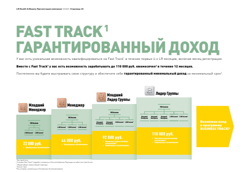 LR Health & Beauty %u041f%u0440%u0435%u0437%u0435%u043d%u0442%u0430%u0446%u0438%u044f %u043a%u043e%u043c%u043f%u0430%u043d%u0438%u0438 %u2013%u2013%u2013%u2013%u2013%u2013%u2013%u2013 %u0421%u0442%u0440%u0430%u043d%u0438%u0446%u0430 22FAST TRACK 1%u0413%u0410%u0420%u0410%u041d%u0422%u0418%u0420%u041e%u0412%u0410%u041d%u041d%u042b%u0419 %u0414%u041e%u0425%u041e%u0414 %u041c%u043b%u0430%u0434%u0448%u0438%u0439 %u041c%u0435%u043d%u0435%u0434%u0436%u0435%u0440%u041b%u0438%u0434%u0435%u0440 %u0413%u0440%u0443%u043f%u043f%u044b + %u0412%u043e%u0437%u043c%u043e%u0436%u043d%u043e%u0441%u0442%u044c %u043f%u043e%u043b%u0443%u0447%u0438%u0442%u044c %u0410%u0432%u0442%u043e%u0431%u043e%u043d%u0443%u0441 %u0438%u043b%u0438 %u0430%u0432%u0442%u043e%u043c%u043e%u0431%u0438%u043b%u044c*+ %u041f%u0440%u044f%u043c%u043e%u0439 %u0434%u043e%u0445%u043e%u0434 %u043e%u0442 %u0442%u043e%u0440%u0433%u043e%u0432%u043e%u0439 %u043d%u0430%u0446%u0435%u043d%u043a%u0438110 000 %u0440%u0443%u0431.+ %u041f%u0440%u044f%u043c%u043e%u0439 %u0434%u043e%u0445%u043e%u0434 %u043e%u0442 %u0442%u043e%u0440%u0433%u043e%u0432%u043e%u0439 %u043d%u0430%u0446%u0435%u043d%u043a%u043822 000 %u0440%u0443%u0431.1 %u0411%u044b%u0441%u0442%u0440%u044b%u0439 %u043f%u0443%u0442%u044c.2 %u0423%u0441%u043b%u043e%u0432%u0438%u044f Fast Track* %u043f%u043e%u0434%u0440%u043e%u0431%u043d%u043e %u0438%u0437%u043b%u043e%u0436%u0435%u043d%u044b %u0432 %u041b%u0438%u0447%u043d%u043e%u043c %u041a%u0430%u0431%u0438%u043d%u0435%u0442%u0435 %u041f%u0430%u0440%u0442%u043d%u0435%u0440%u0430 %u043d%u0430 %u0441%u0430%u0439%u0442%u0435 neo.lrworld.com3 %u041e%u0431%u0449%u0438%u0439 %u043e%u0431%u043e%u0440%u043e%u0442 %u043d%u0438%u0436%u0435%u0441%u0442%u043e%u044f%u0449%u0435%u0439 %u0441%u0442%u0440%u0443%u043a%u0442%u0443%u0440%u044b.4 %u0411%u0438%u0437%u043d%u0435%u0441 %u0422%u0440%u0435%u043a.*%u041d%u0430 %u0443%u0441%u043b%u043e%u0432%u0438%u044f%u0445, %u0438%u0437%u043b%u043e%u0436%u0435%u043d%u043d%u044b%u0445 %u0432 %u041f%u043e%u043b%u043e%u0436%u0435%u043d%u0438%u0438 %u043e%u0431 %u0430%u0432%u0442%u043e%u043f%u0440%u043e%u0433%u0440%u0430%u043c%u043c%u0435.%u0423 %u0432%u0430%u0441 %u0435%u0441%u0442%u044c %u0443%u043d%u0438%u043a%u0430%u043b%u044c%u043d%u0430%u044f %u0432%u043e%u0437%u043c%u043e%u0436%u043d%u043e%u0441%u0442%u044c %u043a%u0432%u0430%u043b%u0438%u0444%u0438%u0446%u0438%u0440%u043e%u0432%u0430%u0442%u044c%u0441%u044f %u043d%u0430 Fast Track1 %u0432 %u0442%u0435%u0447%u0435%u043d%u0438%u0435 %u043f%u0435%u0440%u0432%u044b%u0445 4-%u0445 LR %u043c%u0435%u0441%u044f%u0446%u0435%u0432, %u0432%u043a%u043b%u044e%u0447%u0430%u044f %u043c%u0435%u0441%u044f%u0446 %u0440%u0435%u0433%u0438%u0441%u0442%u0440%u0430%u0446%u0438%u0438.%u0412%u043c%u0435%u0441%u0442%u0435 %u0441 Fast Track1 %u0443 %u0432%u0430%u0441 %u0435%u0441%u0442%u044c %u0432%u043e%u0437%u043c%u043e%u0436%u043d%u043e%u0441%u0442%u044c %u0437%u0430%u0440%u0430%u0431%u0430%u0442%u044b%u0432%u0430%u0442%u044c %u0434%u043e 110 000 %u0440%u0443%u0431. %u0435%u0436%u0435%u043c%u0435%u0441%u044f%u0447%u043d%u043e2 %u0432 %u0442%u0435%u0447%u0435%u043d%u0438%u0435 12 %u043c%u0435%u0441%u044f%u0446%u0435%u0432.%u041f%u043e%u0441%u0442%u0435%u043f%u0435%u043d%u043d%u043e %u0432%u044b %u0431%u0443%u0434%u0435%u0442%u0435 %u0432%u044b%u0441%u0442%u0440%u0430%u0438%u0432%u0430%u0442%u044c %u0441%u0432%u043e%u044e %u0441%u0442%u0440%u0443%u043a%u0442%u0443%u0440%u0443 %u0438 %u043e%u0431%u0435%u0441%u043f%u0435%u0447%u0438%u0442%u0435 %u0441%u0435%u0431%u0435 %u0433%u0430%u0440%u0430%u043d%u0442%u0438%u0440%u043e%u0432%u0430%u043d%u043d%u044b%u0439 %u043c%u0438%u043d%u0438%u043c%u0430%u043b%u044c%u043d%u044b%u0439 %u0434%u043e%u0445%u043e%u0434 %u0437%u0430 %u043c%u0438%u043d%u0438%u043c%u0430%u043b%u044c%u043d%u044b%u0439 %u0441%u0440%u043e%u043a2.100 %u0431%u0430%u043b%u043b%u043e%u04322.000 %u0431%u0430%u043b%u043b%u043e%u04322 2.000 %u0431%u0430%u043b%u043b%u043e%u04322%u041c%u0435%u043d%u0435%u0434%u0436%u0435%u0440 + %u041f%u0440%u044f%u043c%u043e%u0439 %u0434%u043e%u0445%u043e%u0434 %u043e%u0442 %u0442%u043e%u0440%u0433%u043e%u0432%u043e%u0439 %u043d%u0430%u0446%u0435%u043d%u043a%u043844 000 %u0440%u0443%u0431.%u041c%u043b%u0430%u0434%u0448%u0438%u0439 %u041b%u0438%u0434%u0435%u0440 %u0413%u0440%u0443%u043f%u043f%u044b + %u0412%u043e%u0437%u043c%u043e%u0436%u043d%u043e%u0441%u0442%u044c %u043f%u043e%u043b%u0443%u0447%u0438%u0442%u044c %u0410%u0432%u0442%u043e%u0431%u043e%u043d%u0443%u0441 %u0438%u043b%u0438 %u0430%u0432%u0442%u043e%u043c%u043e%u0431%u0438%u043b%u044c*+ %u041f%u0440%u044f%u043c%u043e%u0439 %u0434%u043e%u0445%u043e%u0434 %u043e%u0442 %u0442%u043e%u0440%u0433%u043e%u0432%u043e%u0439 %u043d%u0430%u0446%u0435%u043d%u043a%u043892 000 %u0440%u0443%u0431.%u041c%u043b%u0430%u0434%u0448%u0438%u0439%u041c%u0435%u043d%u0435%u0434%u0436%u0435%u0440%u041c%u043b%u0430%u0434%u0448%u0438%u0439%u041c%u0435%u043d%u0435%u0434%u0436%u0435%u0440100 %u0431%u0430%u043b%u043b%u043e%u04322.000 %u0431%u0430%u043b%u043b%u043e%u04322 2.000 %u0431%u0430%u043b%u043b%u043e%u04322100 %u0431%u0430%u043b%u043b%u043e%u0432%u041c%u043b%u0430%u0434%u0448%u0438%u0439%u041c%u0435%u043d%u0435%u0434%u0436%u0435%u0440%u041c%u043b%u0430%u0434%u0448%u0438%u0439%u041c%u0435%u043d%u0435%u0434%u0436%u0435%u0440%u041c%u043b%u0430%u0434%u0448%u0438%u0439%u041c%u0435%u043d%u0435%u0434%u0436%u0435%u0440 2.000 %u0431%u0430%u043b%u043b%u043e%u04322 2.000 %u0431%u0430%u043b%u043b%u043e%u04322100 %u0431%u0430%u043b%u043b%u043e%u04324.000 %u0431%u0430%u043b%u043b%u043e%u04322 2.000 %u0431%u0430%u043b%u043b%u043e%u04322 2.000 %u0431%u0430%u043b%u043b%u043e%u04322%u0412%u043e%u0437%u043c%u043e%u0436%u0435%u043d %u0432%u0445%u043e%u0434 %u0432 %u043f%u0440%u043e%u0433%u0440%u0430%u043c%u043c%u0443 BUSINESS TRACK!4
