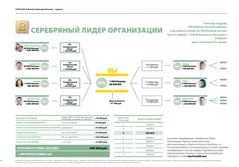 %u043e%u0432%u0438%u044f %u0414%u043b%u044f %u0440%u0430%u0441%u0447%u0435%u0442%u0430 %u0438%u0441%u043f%u043e%u043b%u044c%u0437%u0443%u0435%u0442%u0441%u044f %u0443%u0441%u043b%u043e%u0432%u043d%u043e%u0435 %u0437%u043d%u0430%u0447%u0435%u043d%u0438%u0435 1 %u0431%u0430%u043b%u043b = 40 %u0411%u041e; 1 %u041e%u0431%u0449%u0438%u0439 %u043e%u0431%u043e%u0440%u043e%u0442 %u043d%u0438%u0436%u0435%u0441%u0442%u043e%u044f%u0449%u0435%u0439 %u0441%u0442%u0440%u0443%u043a%u0442%u0443%u0440%u044b; 2 %u041f%u043e%u0434%u0440%u043e%u0431%u043d%u0435%u0435 %u043e %u0431%u043e%u043d%u0443%u0441%u0430%u0445 %u0432 %u041a%u0430%u0440%u044c%u0435%u0440%u043d%u043e%u043c %u041f%u043b%u0430%u043d%u0435 LR; 3 %u0414%u0435%u043d%u0435%u0436%u043d%u044b%u0435 %u0432%u044b%u043f%u043b%u0430%u0442%u044b %u041f%u0430%u0440%u0442%u043d%u0435%u0440%u0430%u043c %u043f%u0440%u043e%u0438%u0437%u0432%u043e%u0434%u044f%u0442%u0441%u044f %u0432 %u043d%u0430%u0446%u0438%u043e%u043d%u0430%u043b%u044c%u043d%u043e%u0439 %u0432%u0430%u043b%u044e%u0442%u0435. 4 %u0412%u043e%u0437%u043c%u043e%u0436%u043d%u043e%u0441%u0442%u044c %u043f%u0440%u0438%u043d%u044f%u0442%u044c %u0443%u0447%u0430%u0441%u0442%u0438%u0435 %u0432 %u043d%u0430%u0448%u0435%u0439 %u0443%u043d%u0438%u043a%u0430%u043b%u044c%u043d%u043e%u0439 %u0410%u0432%u0442%u043e%u043f%u0440%u043e%u0433%u0440%u0430%u043c%u043c%u0435 LR %u0438 %u043f%u043e%u043b%u0443%u0447%u0438%u0442%u044c %u043a%u043e%u0440%u043f%u043e%u0440%u0430%u0442%u0438%u0432%u043d%u044b%u0439 %u0430%u0432%u0442%u043e%u043c%u043e%u0431%u0438%u043b%u044c %u0432 %u043f%u043e%u043b%u044c%u0437%u043e%u0432%u0430%u043d%u0438%u0435 %u043f%u0440%u0438 %u0432%u044b%u043f%u043e%u043b%u043d%u0435%u043d%u0438%u0438 %u0441%u043e%u043e%u0442%u0432%u0435%u0442%u0441%u0442%u0432%u0443%u044e%u0449%u0438%u0445 %u0443%u0441%u043b%u043e%u0432%u0438%u0439 %u0438 %u043a%u0432%u0430%u043b%u0438%u0444%u0438%u043a%u0430%u0446%u0438%u0438. %u041f%u043e%u043b%u043d%u044b%u0435 %u0438 %u043f%u043e%u0434%u0440%u043e%u0431%u043d%u044b%u0435 %u0443%u0441%u043b%u043e%u0432%u0438%u044f %u0410%u0432%u0442%u043e%u043f%u0440%u043e%u0433%u0440%u0430%u043c%u043c%u044b LR %u0412%u044b %u043c%u043e%u0436%u0435%u0442%u0435 %u043d%u0430%u0439%u0442%u0438 %u0432 %u041b%u0438%u0447%u043d%u043e%u043c %u041a%u0430%u0431%u0438%u043d%u0435%u0442%u0435 %u041f%u0430%u0440%u0442%u043d%u0435%u0440%u0430 %u043d%u0430 %u0441%u0430%u0439%u0442%u0435 www.neo.lrworld.com%u0421%u0415%u0420%u0415%u0411%u0420%u042f%u041d%u042b%u0419 %u041b%u0418%u0414%u0415%u0420 %u041e%u0420%u0413%u0410%u041d%u0418%u0417%u0410%u0426%u0418%u04183 %u043c%u0435%u0441%u044f%u0446%u0430 %u043f%u043e%u0434%u0440%u044f%u0434100 %u0431%u0430%u043b%u043b%u043e%u0432 %u043b%u0438%u0447%u043d%u044b%u0439 %u043e%u0431%u043e%u0440%u043e%u0442,6 %u0430%u043a%u0442%u0438%u0432%u043d%u044b%u0445 %u043b%u0438%u043d%u0438%u0439 %u043f%u043e 500 %u0431%u0430%u043b%u043b%u043e%u0432, %u0438%u0437 %u043d%u0438%u04454%u044521% %u043b%u0438%u043d%u0438%u0439 + 12 000 %u0431%u0430%u043b%u043b%u043e%u0432 %u043e%u0441%u0442%u0430%u0442%u043e%u0447%u043d%u043e%u0433%u043e %u043e%u0431%u043e%u0440%u043e%u0442%u0430%u0438%u043b%u0438 5 %u0438 %u0431%u043e%u043b%u0435%u0435 21% %u043b%u0438%u043d%u0438%u0439LR Health & Beauty %u041a%u0430%u0440%u044c%u0435%u0440%u043d%u044b%u0439 %u043f%u043b%u0430%u043d %u2013 %u043a%u0440%u0430%u0442%u043a%u043e %u0414%u041e%u0425%u041e%u0414 %u041e%u0422 %u041f%u0420%u041e%u0414%u0410%u0416 %u043f%u0440%u0438%u0431%u043b. 40% %u043e%u0442 48 000 %u0440%u0443%u0431. (%u0437%u0430%u043a%u0443%u043f%u043a%u0430: 48 000 %u0440%u0443%u0431., %u043f%u0440%u043e%u0434%u0430%u0436%u0430: 67 200 %u0440%u0443%u0431.) = 19 200 %u0440%u0443%u0431.%u0411%u041e%u041d%u0423%u0421 %u0417%u0410 %u041b%u0418%u0427%u041d%u042b%u0419 %u041e%u0411%u041e%u0420%u041e%u0422 21% %u043e%u0442 40 000 %u0411%u041e = 8 400 %u0440%u0443%u0431.%u0411%u041e%u041d%u0423%u0421 %u0417%u0410 %u0420%u0410%u0417%u041d%u0418%u0426%u0423 %u0411%u041e%u041d%u0423%u0421%u041d%u042b%u0425 %u0423%u0420%u041e%u0412%u041d%u0415%u0419 %u0441%u0443%u043c%u043c%u0438%u0440%u0443%u0435%u0442%u0441%u044f = 43 200 %u0440%u0443%u0431.%u041b%u0418%u0414%u0415%u0420%u0421%u041a%u0418%u0419 %u0411%u041e%u041d%u0423%u0421 3% %u043e%u0442 800 000 %u0411%u041e = 24 000 %u0440%u0443%u0431.%u0421%u041f%u0415%u0426%u0418%u0410%u041b%u042c%u041d%u042b%u0419 %u0411%u041e%u041d%u0423%u0421 8% %u043e%u0442 5 280 000 %u0411%u041e = 422 400 %u0440%u0443%u0431.%u0411%u041e%u041d%u0423%u0421 %u0417%u0410 %u041e%u0411%u0423%u0427%u0415%u041d%u0418%u0415 %u043e%u0442 4 x 21% ~ 32 000 %u0440%u0443%u0431.%u0418%u0422%u041e%u0413%u041e%u0412%u0410%u042f %u0421%u0423%u041c%u041c%u0410 %u0414%u041e%u0425%u041e%u0414%u0410 549 200 %u0440%u0443%u0431.+ %u0410%u0412%u0422%u041e%u041f%u0420%u041e%u0413%u0420%u0410%u041c%u041c%u0410 LR4%u041d%u0430 %u0443%u0440%u043e%u0432%u043d%u0435 %u043a%u0432%u0430%u043b%u0438%u0444%u0438%u043a%u0430%u0446%u0438%u0438 %u0421%u0435%u0440%u0435%u0431%u0440%u044f%u043d%u044b%u0439 %u041b%u0438%u0434%u0435%u0440 %u041e%u0440%u0433%u0430%u043d%u0438%u0437%u0430%u0446%u0438%u0438 %u041f%u0430%u0440%u0442%u043d%u0435%u0440 %u043c%u043e%u0436%u0435%u0442 %u0432%u044b%u043f%u043e%u043b%u043d%u0438%u0442%u044c %u0434%u043e%u043f%u043e%u043b%u043d%u0438%u0442%u0435%u043b%u044c%u043d%u044b%u0435 %u0443%u0441%u043b%u043e%u0432%u0438%u044f %u0438 %u043f%u043e%u043b%u0443%u0447%u0438%u0442%u044c %u0410%u0432%u0442%u043e%u0431%u043e%u043d%u0443%u0441 %u0437%u0430 %u041b%u0438%u0447%u043d%u044b%u0439 %u0430%u0432%u0442%u043e%u043c%u043e%u0431%u0438%u043b%u044c %u043f%u043e%u0441%u043b%u0435 %u0432%u044b%u043f%u043e%u043b%u043d%u0435%u043d%u0438%u044f %u0441%u043e%u043e%u0442%u0432%u0435%u0442%u0441%u0442%u0432%u0443%u044e%u0449%u0435%u0439 %u043a%u0432%u0430%u043b%u0438%u0444%u0438%u043a%u0430%u0446%u0438%u0438 3 %u043c%u0435%u0441%u044f%u0446%u0430 %u043f%u043e%u0434%u0440%u044f%u0434. %u041f%u043e%u0434%u0440%u043e%u
