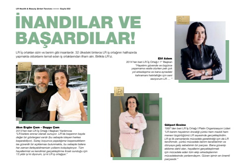 LR Health & Beauty %u015eirket Tan%u0131t%u0131m%u0131 %u2013%u2013%u2013%u2013%u2013%u2013%u2013%u2013 Sayfa 032%u0130NANDILAR VE BA%u015eARDILAR!LR %u0130%u015f ortaklar%u0131 sizin ve benim gibi insanlard%u0131r. 32 %u00fclkedeki binlerce LR i%u015f orta%u011f%u0131n%u0131n halihaz%u0131rda yapmakta olduklar%u0131n%u0131 temsil eden i%u015f ortaklar%u0131ndan ilham al%u0131n. Birlikte LR%u2018%u0131z. Elif Adem2014%u2019ten beri LR %u0130%u015f Orta%u011f%u0131 I 1* Ba%u015fkan%u201cHayat%u0131m%u0131%u00a0g%u00fcvende ve %u00f6zg%u00fcrce ya%u015famama%u00a0vesile olurken%u00a0pek %u00e7ok yol arkada%u015f%u0131ma ve bana aynadaki kahraman%u0131 hat%u0131rlatt%u0131%u011f%u0131n i%u00e7in seni seviyorum LR %u2026%u00a0%u201cAk%u0131n Erg%u00fcn %u00c7am - Duygu %u00c7am 2013%u2019ten beri LR %u0130%u015f Orta%u011f%u0131 I Ba%u015fkan Yard%u0131mc%u0131s%u0131%u201cLR bizlere s%u0131n%u0131rs%u0131z olanak sunuyor. LR%u2019da ba%u015far%u0131n%u0131n kayda de%u011fer bir g%u00f6stergesi vard%u0131r (bu sebeple isteyen herkes ba%u015farabiliyor). S%u00fcre%u00e7 boyunca ya%u015fad%u0131%u011f%u0131m%u0131z ba%u015far%u0131s%u0131zl%u0131klar%u0131n ise g%u00fcvenilir bir a%u00e7%u0131klamas%u0131 bulunmakta, bu sebeple bizlere her zaman ilerleyebilmemizin yollar%u0131n%u0131 kolayla%u015ft%u0131r%u0131yor. T%u00fcm hayallerimizi ve kendimizi ger%u00e7ekle%u015ftirme f%u0131rsat%u0131 sundu%u011fu i%u00e7in 13 y%u0131ld%u0131r iyi ki diyorum, iyi ki LR i%u015f orta%u011f%u0131y%u0131z.%u201dG%u00fclperi Evsine1997%u2019den beri LR %u0130%u015f Orta%u011f%u0131 I Platin Organizasyon Lideri%u201cLR benim hayat%u0131m%u0131n %u00f6nceli%u011fi %u00e7%u00fcnk%u00fc hem maddi hem manevi %u00f6zg%u00fcrl%u00fc%u011f%u00fcm%u00fc LR sayesinde ger%u00e7ekle%u015ftirdim. LR i%u015fi ilk zamanlarda m%u00fccadele gerektirdi%u011fi i%u00e7in de LR tercihimdir, %u00e7%u00fcnk%u00fc m%u00fccadele benim karakterimin ve d%u00fcnyaya geli%u015f sebebimin bir par%u00e7as%u0131. Bana g%u00fcvenip ekibime dahil olan, hayallerini ger%u00e7ekle%u015ftirmek i%u00e7in m%u00fccadele eden t%u00fcm ekip arkada%u015flar%u0131m%u0131n m%u00fccadelesinde yanlar%u0131nday%u0131m.%u00a0G%u00fcven i%u015fimin en %u00f6nemli par%u00e7as%u0131d%u0131r.%u201d