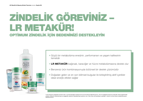 LR Health & Beauty %u015eirket Tan%u0131t%u0131m%u0131 %u2013%u2013%u2013%u2013%u2013%u2013%u2013%u2013 Sayfa 06%u2022 G%u00fc%u00e7l%u00fc bir metabolizma enerjinin, performans%u0131n ve ya%u015fam kalitesinin temelidir%u2022 LR METAK%u00dcR ba%u011f%u0131rsak, karaci%u011fer ve h%u00fccre metabolizmas%u0131na destek olur%u2022 Benzersiz %u00fcr%u00fcn kombinasyonuyla b%u00fct%u00fcnsel bir destek %u00e7%u00f6z%u00fcm%u00fcd%u00fcr%u2022 Do%u011fadan gelen ve en son bilimsel bulgular ile birle%u015ftirilmi%u015f aktif i%u00e7erikler ideal sinerjik etkileri sa%u011flar%u00b9Liver Support i%u00e7eri%u011finde bulunan kolin, normal karaci%u011fer fonksiyonunun korunmas%u0131na katk%u0131da bulunur. Pro12 i%u00e7eri%u011finde bulunan probiyotik mikroorganizmalar sindirim sistemini d%u00fczenlemeye ve ba%u011f%u0131%u015f%u0131kl%u0131k sistemini desteklemeye yard%u0131mc%u0131 olur. Aloe Vera Jel %u0130%u00e7eceklerin i%u00e7erdi%u011fi C vitamini normal enerji metabolizmas%u0131na katk%u0131da bulunur.Z%u0130NDEL%u0130K G%u00d6REV%u0130N%u0130Z %u2013 LR METAK%u00dcR!OPT%u0130MUM Z%u0130NDEL%u0130K %u0130%u00c7%u0130N BEDEN%u0130N%u0130Z%u0130 DESTEKLEY%u0130N