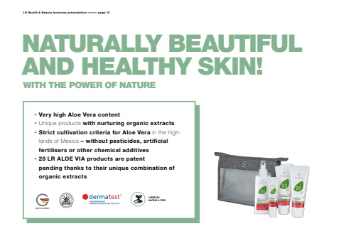 MADE IN GERMANY LIEBE ZUNATUR & TIERLR Health & Beauty business presentation %u2013%u2013%u2013%u2013%u2013%u2013%u2013%u2013 page 12%u2022 Very high Aloe Vera content%u2022 Unique products with nurturing organic extracts%u2022 Strict cultivation criteria for Aloe Vera in the highlands of Mexico %u2013 without pesticides, artificial fertilisers or other chemical additives%u2022 28 LR ALOE VIA products are patentpending thanks to their unique combination of organic extractsWITH THE POWER OF NATURE NATURALLY BEAUTIFUL AND HEALTHY SKIN!LIEBE ZU NATUR & TIER