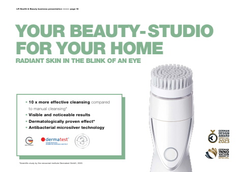 MADE IN GERMANYLR Health & Beauty business presentation %u2013%u2013%u2013%u2013%u2013%u2013%u2013%u2013 page 16%u2022 10 x more effective cleansing compared to manual cleansing*%u2022 Visible and noticeable results %u2022 Dermatologically proven effect*%u2022 Antibacterial microsilver technology*Scientific study by the renowned institute Dermatest GmbH, 2022.YOUR BEAUTY-STUDIO FOR YOUR HOMERADIANT SKIN IN THE BLINK OF AN EYE