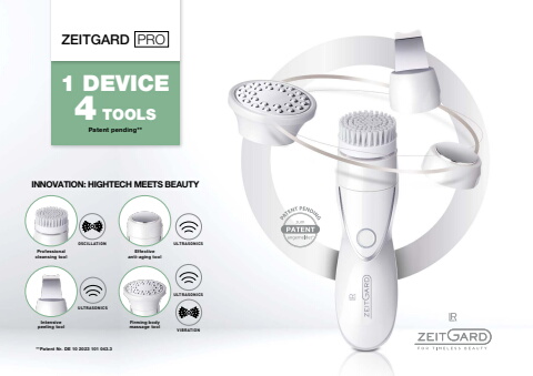 ZEITGARD PROOSCILLATIONULTRASONICSULTRASONICSULTRASONICSVIBRATIONINNOVATION: HIGHTECH MEETS BEAUTYIntensivepeeling toolProfessionalcleansing toolEffectiveanti-aging toolFirming bodymassage tool**Patent Nr. DE 10 2023 101 043.3Patent pending**1 DEVICE 4TOOLS