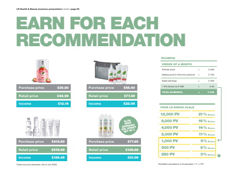 LR Health & Beauty business presentation %u2013%u2013%u2013%u2013%u2013%u2013%u2013%u2013 page 20EARN FOR EACH RECOMMENDATIONPurchase price %u00a330.80Retail price %u00a342.99Income %u00a312.19ALOE VERA DRINKING GEL HONEYSET OF 3ORDER OF A MONTHPartner price = %u00a3 500Selling price to the end customer = %u00a3 700Sales earnings = %u00a3 200+ 9 % bonus on %u00a3 500 = %u00a3 45TOTAL EARNINGS: = %u00a3 245EXAMPLEPurchase price %u00a377.80Retail price %u00a3108.89Income %u00a331.09Purchase price %u00a3413.50Retail price %u00a3578.99Income %u00a3165.49Simplified calculations in all examples 1 %u00a3 = 2 PV12,000 PV 21% Bonus8,000 PV 16% Bonus4,000 PV 14% Bonus2,000 PV 11% Bonus1,000 PV 9% Bonus 500 PV 6% Bonus250 PV 3% BonusYOUR LR BONUS SCALE*Purchase price %u00a355.40Retail price %u00a377.49Income %u00a322.09These are price examples. (As of July 2024)