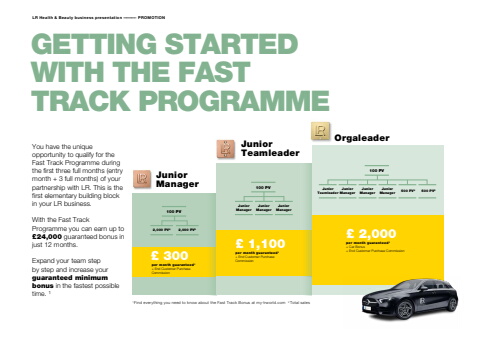 LR Health & Beauty business presentation %u2013%u2013%u2013%u2013%u2013%u2013%u2013%u2013 PROMOTIONGETTING STARTED WITH THE FAST TRACK PROGRAMMEOrgaleaderJunior ManagerJunior ManagerJunior Manager100 PV JuniorManagerJunior Teamleader%u00a3 1,100 %u00a3 300 100 PVJunior ManagerJunior ManagerJunior Manager 100 PV2,000 PV%u00b2 2,000 PV%u00b21 Find everything you need to know about the Fast Track Bonus at my-lrworld.com 2 Total sales%u00a3 2,000 500 PV%u00b2 Junior Teamleader 500 PV%u00b2You have the unique opportunity to qualify for the Fast Track Programme during the first three full months (entry month + 3 full months) of your partnership with LR. This is the first elementary building block in your LR business.With the Fast Track Programme you can earn up to %u00a324,000 guaranteed bonus in just 12 months.Expand your team step by step and increase your guaranteed minimum bonus in the fastest possible time. %u00b9per month guaranteed1+ End Customer Purchase Commissionper month guaranteed1+ End Customer Purchase Commissionper month guaranteed1+ Car Bonus+ End Customer Purchase Commission