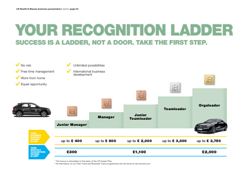 LR Health & Beauty business presentation %u2013%u2013%u2013%u2013%u2013%u2013%u2013%u2013 page 34YOUR RECOGNITION LADDERNo riskFree time management Work from home Equal opportunityUnlimited possibilitiesInternational business developmentJunior ManagerJunior Manager TeamleaderOrgaleaderTeamleaderSUCCESS IS A LADDER, NOT A DOOR. TAKE THE FIRST STEP.%u00b9 The bonus is calculated on the basis of the LR Career Plan.%u00b2 All information on our Fast Track and Business Track programmes can be found at neo.lrworld.com.YOUR POSSIBLEMONTHLY INCOME%u00b9IN GBPYOURMONTHLYGUARANTEED INCOMEIN GBP%u00b2up to %u00a3 400 up to %u00a3 800 up to %u00a3 2,000 up to %u00a3 3,000 up to %u00a3 3,750%u00a3300 %u00a31,100 %u00a32,000