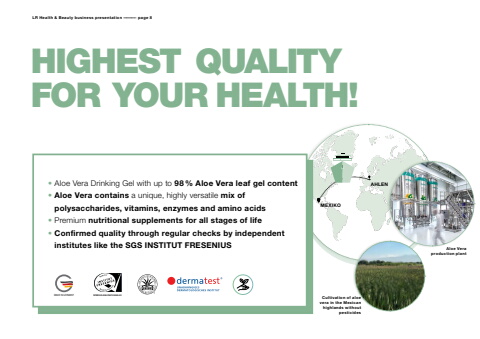 MADE IN GERMANY WWW.SGS-QUALITAETSSIEGEL.DELIEBE ZUNATUR & TIERLR Health & Beauty business presentation %u2013%u2013%u2013%u2013%u2013%u2013%u2013%u2013 page 8HIGHEST QUALITYFOR YOUR HEALTH!Cultivation of aloe vera in the Mexican highlands without pesticidesMEXIKO%u2022 Aloe Vera Drinking Gel with up to 98% Aloe Vera leaf gel content AHLEN%u2022 Aloe Vera contains a unique, highly versatile mix ofpolysaccharides, vitamins, enzymes and amino acids%u2022 Premium nutritional supplements for all stages of life%u2022 Confirmed quality through regular checks by independentinstitutes like the SGS INSTITUT FRESENIUS Aloe Veraproduction plant