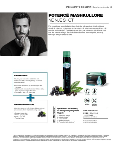 LAKTOSEFREIZUCKER-+ FREI39 19,150 Lek%u00eb(2,553 Lek%u00eb p%u00ebr 100 ml)81020 | 30 x 25 ml1 Tiamina, vitamina B6, vitamina B12 dhe magnezi kontribuojn%u00eb n%u00eb metabolizimin normal t%u00eb energjis%u00eb. Vitamina B6, Vitamina B12 dhe Magnezi ndihmojn%u00eb n%u00eb reduktimin e lodhjes. 2 Riboflavina, vitamina A, vitamina B2, niacina, biotina dhe zinku ndihmojn%u00eb n%u00eb mir%u00ebmbajtjen e l%u00ebkur%u00ebs normale. Vitamina C kontribuon n%u00eb formimin normal t%u00eb kolagjenit p%u00ebr funksionimin normal t%u00eb l%u00ebkur%u00ebs. 3 Biotina dhe zinku ndihmojn%u00eb n%u00eb mir%u00ebmbajtjen e flok%u00ebve. 4 Magnezi kontribuon n%u00eb funksionimin normal t%u00eb muskujve. Tiamina, vitamina B6, vitamina B12 dhe magnezi kontribuojn%u00eb n%u00eb metabolizimin normal t%u00eb energjis%u00eb. 5 Zinku ndihmon n%u00eb ruajtjen e niveleve normale t%u00eb testosteronit n%u00eb gjak. Seleni kontribuon n%u00eb formimin normal t%u00eb sperm%u00ebs. Zinku kontribuon n%u00eb pjellorin%u00eb normale dhe riprodhimin normal. *Suplementet dietike nuk jan%u00eb z%u00ebvend%u00ebsues i nj%u00eb diete t%u00eb larmishme dhe t%u00eb ekuilibruar dhe nj%u00eb stili jetese t%u00eb sh%u00ebndetsh%u00ebm.SPECIALIST%u00cbT E SH%u00cbNDETIT | Bukuria nga brendaKOMPLEKSI AKTIV Aktivizon pes%u00eb proceset e nd%u00ebrtimit t%u00eb an%u00ebs mashkullore n%u00eb trup me nj%u00eb p%u00ebrzierje inovative t%u00eb p%u00ebrb%u00ebr%u00ebsve aktiv%u00eb:%u2022 Specialist%u00eb t%u00eb nd%u00ebrtimit, t%u00eb till%u00eb si kolagjeni dhe L-arginina%u2022 5 p%u00ebrforcuesh mineralesh efektive, t%u00eb tilla si zinku, bakri, magnezi, mangani dhe seleni%u2022 P%u00ebrmbajtje e lart%u00eb e 10 vitaminave POTENC%u00cb MASHKULLORE N%u00cb NJ%u00cb SHOTPija inovative e energjis%u00eb p%u00ebrmban fuqin%u00eb e p%u00ebrqendruar t%u00eb p%u00ebrb%u00ebr%u00ebsve aktiv%u00eb t%u00eb zgjedhur ngashkenca dhe natyra, t%u00eb p%u00ebrshtatura posa%u00e7%u00ebrisht p%u00ebr nevojat e meshkujve. Zgjidhja juaj p%u00ebr gjith%u00e7ka, n%u00eb vet%u00ebm nj%u00eb shot n%u00eb dit%u00eb. P%u00ebr m%u00eb shum%u00eb energji, l%u00ebkur%u00eb t%u00eb sh%u00ebndetshme, flok%u00eb t%u00eb plot%u00eb, muskuj t%u00ebrheq%u00ebs dhe potenc%u00eb t%u00eb lart%u00ebKOMPLEKSI PARANDALUESMbron dhe punon n%u00eb m%u00ebnyr%u00eb parandaluese p%u00ebrmes nj%u00eb kombinimi efektiv t%u00eb p%u00ebrb%u00ebr%u00ebsve nga natyra:%u2022 Ekstrakt i piperit t%u00eb zi%u2022 Kafein%u00eb nga %u00e7aji jeshil%u2022 Rrush i zi pa fara%u2022 Portokalli i kuqPA LAKTOZ%u00cb PA GLUTENPA SHEQER PA NGJYRUES ARTIFFICIALDoza e rekomanduar: %u2022 Pini 1 x 1 shot n%u00eb dit%u00eb5in1 Men's Shot*1. M%u00eb shum%u00eb energji12. L%u00ebkur%u00eb t%u00eb bukur23. Flok%u00eb t%u00eb fort%u00eb34. Muskujt t%u00ebrheq%u00ebs45. Potenc%u00eb t%u00eb sh%u00ebndetshme 5IN1 MEN%u2018S SHOT5Nj%u00eb shot 5in1 p%u00ebr meshkuj n%u00eb dit%u00eb siguron p%u00ebr nj%u00eb koh%u00eb t%u00eb gjat%u00eb: