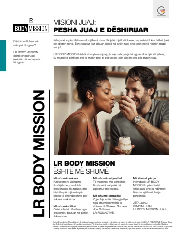 LR BODY MISSIONKontrolli i pesh%u00ebs: Z%u00ebvend%u00ebsimi i dy vakteve kryesore ditore, si pjes%u00eb e nj%u00eb diete me kalori t%u00eb ul%u00ebt me nj%u00eb vakt t%u00eb till%u00eb (LR FIGUACTIVE Shakes, Supa dhe Drith%u00ebra) kontribuon n%u00eb humbjen e pesh%u00ebs. P%u00ebr t%u00eb arritur efektin e d%u00ebshiruar, dy vakte kryesore duhet t%u00eb z%u00ebvend%u00ebsohen %u00e7do dit%u00eb. Ruajtja e pesh%u00ebs: Z%u00ebvend%u00ebsimi i nj%u00eb prej vakteve kryesore ditore, si pjes%u00eb e nj%u00eb diete me kalori t%u00eb ul%u00ebt, me nj%u00eb vakt t%u00eb till%u00eb (LR FIGUACTIVE Shakes, Supa dhe Drith%u00ebra) ndihmon n%u00eb ruajtjen e pesh%u00ebs pas humbjes s%u00eb saj. P%u00ebr t%u00eb arritur efektin e d%u00ebshiruar, nj%u00eb vakt kryesor duhet t%u00eb z%u00ebvend%u00ebsohet %u00e7do dit%u00eb.MISIONI JUAJ: PESHA JUAJ E D%u00cbSHIRUARD%u00ebshironi t%u00eb hani n%u00eb m%u00ebnyr%u00eb t%u00eb zgjuar?LR BODY MISSION %u00ebsht%u00eb shoq%u00ebruesi juaj p%u00ebr nje ushqyerje t%u00eb zgjuar.Jeta jon%u00eb e p%u00ebrditshme ndonj%u00ebher%u00eb mund t%u00eb jet%u00eb mjaft sfiduese, ve%u00e7an%u00ebrisht kur b%u00ebhet fjal%u00eb p%u00ebr diet%u00ebn ton%u00eb. %u00cbsht%u00eb bukur kur dikush %u00ebsht%u00eb n%u00eb an%u00ebn tuaj dhe ec%u00ebn n%u00eb t%u00eb nj%u00ebjt%u00ebn rrug%u00eb me ju!LR BODY MISSION %u00ebsht%u00eb shoq%u00ebruesi juaj p%u00ebr nje ushqyerje t%u00eb zgjuar dhe nj%u00eb stil jetese, ku mund t%u00eb p%u00ebrfitoni m%u00eb t%u00eb mir%u00ebn prej tij p%u00ebr veten, p%u00ebr diet%u00ebn dhe p%u00ebr trupin tuaj.LR BODY MISSION %u00cbSHT%u00cb M%u00cb SHUM%u00cb!M%u00eb shum%u00eb sukses Funksionon: Ushqime t%u00eb shijshme, produkte shoq%u00ebruese t%u00eb zgjuara dhe k%u00ebshilla p%u00ebr nj%u00eb m%u00ebnyr%u00eb jetese t%u00eb sh%u00ebndetshme p%u00ebr sukses maksimal.M%u00eb shum%u00eb cil%u00ebsiCil%u00ebsi e lart%u00eb: Zhvilluar nga ekspert%u00ebt, bazuar n%u00eb gjetjet shkencore.M%u00eb shum%u00eb natyralitetT%u00eb ve%u00e7anta: Me p%u00ebrb%u00ebr%u00ebs t%u00eb shumt%u00eb natyral%u00eb, t%u00eb zgjedhur me kujdes.M%u00eb shum%u00eb k%u00ebnaq%u00ebsiZgjedhje e lir%u00eb: P%u00ebrzgjedhje nga shumllojshm%u00ebria e shijeve t%u00eb Shakes, Supave dhe Drithrave LR FIGUACTIVE. M%u00eb shum%u00eb p%u00ebr juIndividual: LR BODY MISSION i p%u00ebrshtatet jet%u00ebs suaj dhe ju ndihmon t%u00eb arrini q%u00ebllimet tuaja personale.JETA JUAJ.VENDIMI JUAJ. LR BODY MISSION JUAJ.