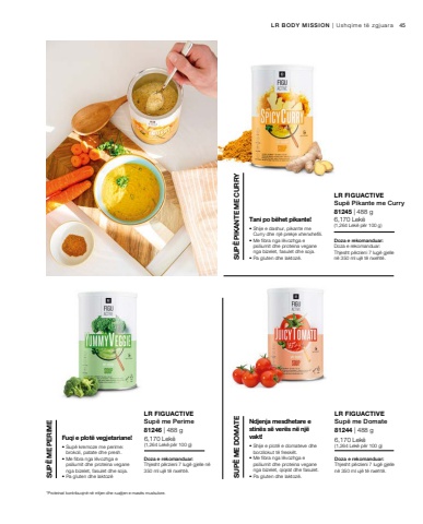 45 6,170 Lek%u00eb(1,264 Lek%u00eb p%u00ebr 100 g)6,170 Lek%u00eb(1,264 Lek%u00eb p%u00ebr 100 g)6,170 Lek%u00eb(1,264 Lek%u00eb p%u00ebr 100 g)81246 | 488 g 81244 | 488 g81245 | 488 g*Proteinat kontribuojn%u00eb n%u00eb rritjen dhe ruajtjen e mas%u00ebs muskulore.LR BODY MISSION | Ushqime t%u00eb zgjuaraDoza e rekomanduar: Thjesht p%u00ebrzieni 7 lug%u00eb gjelle n%u00eb 350 ml uj%u00eb t%u00eb nxeht%u00eb.LR FIGUACTIVESup%u00eb me Perime Doza e rekomanduar: Thjesht p%u00ebrzieni 7 lug%u00eb gjelle n%u00eb 350 ml uj%u00eb t%u00eb nxeht%u00eb. LR FIGUACTIVESup%u00eb me Domate%u2022 Sup%u00eb kremoze me perime: brokoli, patate dhe presh.%u2022 Me fibra nga l%u00ebvozhga e psiliumit dhe proteina vegane nga bizelet, fasulet dhe soja. SUP%u00cb ME PERIME%u2022 Pa gluten dhe laktoz%u00ebFuqi e plot%u00eb vegjetariane!%u2022 Shije e plot%u00eb e domateve dhe borzilokut t%u00eb fresk%u00ebt.%u2022 Me fibra nga l%u00ebvozhga e psiliumit dhe proteina vegane nga bizelet, qiqrat dhe fasulet. SUP%u00cb ME DOMATE%u2022 Pa gluten dhe laktoz%u00eb.Ndjenja mesdhetare e stin%u00ebs s%u00eb ver%u00ebs n%u00eb nj%u00eb vakt!Doza e rekomanduar: Doza e rekomanduar:Thjesht p%u00ebrzieni 7 lug%u00eb gjelle n%u00eb 350 ml uj%u00eb t%u00eb nxeht%u00eb.LR FIGUACTIVESup%u00eb Pikante me Curry%u2022 Shije e dashur, pikante me Curry dhe nj%u00eb prekje xhenxhefili.%u2022 Me fibra nga l%u00ebvozhga e psiliumit dhe proteina vegane nga bizelet, fasulet dhe soja. SUP%u00cb PIKANTE ME CURRY%u2022 Pa gluten dhe laktoz%u00eb.Tani po b%u00ebhet pikante!