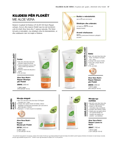OILS 7OILS 745%15%60%15%67 2,260 Lek%u00eb(1,130 Lek%u00eb p%u00ebr 100 ml)1,810 Lek%u00eb(1,207 Lek%u00eb p%u00ebr 100 ml)1,810 Lek%u00eb(905 Lek%u00eb p%u00ebr 100 ml) 1,500 Lek%u00eb(750 Lek%u00eb p%u00ebr 100 ml)20648 | 200 ml20730 | 200 ml 20647 | 150 ml20649 | 200 mlKUJDESI ALOE VERA | Kujdesi p%u00ebr goj%u00ebn, dh%u00ebmb%u00ebt dhe flok%u00ebt* Kur p%u00ebrdoret n%u00eb kombinim me shampo, balsam dhe mask%u00eb. Konfirmuar nga testet biofizike t%u00eb fuqis%u00eb s%u00eb krehjes dhe efektit kund%u00ebr thyerjes s%u00eb flok%u00ebve n%u00eb krahasim me nj%u00eb shampo neutrale, t%u00eb kryer nga proDERM n%u00eb janar 2018. ** Studim i kryer nga Dermatest n%u00eb dhjetor 2017 n%u00eb 40 persona.Aloe VeraAloe VeraAloe VeraAloe VeraKUJDESI P%u00cbR FLOK%u00cbTME ALOE VERASistemi i kujdesit t%u00eb flok%u00ebve LR ALOE VIA Nutri-Repair ushqen, forcon dhe riparon flok%u00ebt tuaj me nj%u00eb kombinim unik t%u00eb xhelit Aloe Vera dhe 7 vajrave natyrale. P%u00ebr flok%u00eb t%u00eb but%u00eb si m%u00ebndafsh, me shk%u00eblqim dhe t%u00eb sh%u00ebndetsh%u00ebm, si dhe vet%u00ebbesim deri n%u00eb maj%u00ebn e flok%u00ebve.But%u00ebsi e m%u00ebndafsht%u00eb: deri n%u00eb 3 her%u00eb m%u00eb t%u00eb lehta*Shk%u00eblqim dhe sh%u00ebndet:m%u00eb tep%u00ebr se 90% m%u00eb pakk%u00ebputje flok%u00ebsh*Arom%u00eb vitalizuese:95% e personave t%u00eb testuar e p%u00eblqejn%u00eb arom%u00ebn**Aloe Vera NutriRepair Shampo p%u00ebr Flok%u00ebt%u2022 Me 45% xhel Aloe Vera dhe ekstrakt organik bambuje.%u2022 Pastron but%u00ebsisht, forcon dhe mbron flok%u00ebt nga faktor%u00ebt e jasht%u00ebm.%u2022 Hidraton flok%u00ebt dhe l%u00ebkur%u00ebn e kok%u00ebs. SHAMPO P%u00cbR FLOK%u00cbT%u2022 P%u00ebr %u00e7do larje.Fort%u00ebsiAloe Vera NutriRepairMask%u00eb p%u00ebr Flok%u00ebt%u2022 Me 15% xhel Aloe Vera dhe Nutri-Oil-RepairComplex me 7 vajra.%u2022 Ushqen dhe riparon flok%u00ebt n%u00eb thell%u00ebsi, rikthen stabilitetin n%u00eb flok%u00eb dhe parandalon p%u00ebr nj%u00eb koh%u00eb t%u00eb gjat%u00eb k%u00ebputjen e flok%u00ebve. MASK%u00cb P%u00cbR FLOK%u00cbT%u2022 Aplikojeni 1%u20132 her%u00eb n%u00eb jav%u00eb me shp%u00eblarje.Mbrojtje afatgjat%u00ebAloe Vera NutriRepair Leave-In Kur%u00eb%u2022 Me 60% xhel Aloe Vera dhe ekstrakt organik bambuje.%u2022 Vepron si nj%u00eb shtres%u00eb mbrojt%u00ebse ndaj nxeht%u00ebsis%u00eb.%u2022 Ushqen dhe hidraton flok%u00ebt.%u2022 Ideale para ose gjat%u00eb stilimit me ngrohje (tharja me thar%u00ebse ose drejtimi me LEAVE-IN KUR%u00cbpiaster) %u2013 pa shp%u00eblarje.Mbrojtje nga nxeht%u00ebsiaAloe Vera NutriRepair Balsam p%u00ebr Flok%u00ebt %u2022 Me 15% xhel Aloe Vera dhe Nutri- Oil-Repair-Complex me 7 vajra.%u2022 Ushqen dhe riparon flok%u00ebt.%u2022 Zbut dhe ushqen l%u00ebkur%u00ebn e kok%u00ebs. BALSAM P%u00cbR FLOK%u00cbT%u2022 P%u00ebr %u00e7do larje.But%u00ebsi