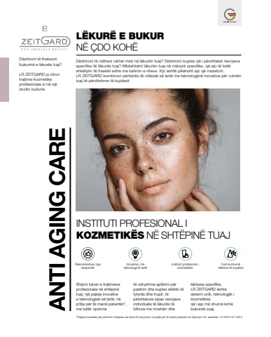 INNOVATIV,HOCHTECHNOLOGISCHVON EXPERTENEMPFOHLENPROFESSIONELLEINSTITUTKOSMETIKHOCHEFFEKTIVEPFLEGEFORMELN ANTI AGING CARE Shijoni luksin e trajtimeve profesionale n%u00eb sht%u00ebpin%u00eb tuaj: nj%u00eb pajisje inovative e teknologjis%u00eb s%u00eb lart%u00eb, n%u00eb pritje p%u00ebr t%u00eb marr%u00eb patent%u00ebn*, me kat%u00ebr opsione t%u00eb ndryshme aplikimi p%u00ebr pastrim dhe kujdes efektiv t%u00eb fytyr%u00ebs dhe trupit, t%u00eb p%u00ebrshtatura sipas nevojave individuale t%u00eb l%u00ebkur%u00ebs t%u00eb lidhura me mosh%u00ebn dhe k%u00ebrkesa specifike. LR ZEITGARD %u00ebsht%u00eb sistemi unik, teknologjik i kozmetik%u00ebs q%u00eb i jep m%u00eb shum%u00eb koh%u00eb bukuris%u00eb suaj.*Pajisje kozmetike p%u00ebr p%u00ebrdorim sht%u00ebpiak me koka t%u00eb ndryshme, n%u00eb pritje p%u00ebr t%u00eb marr%u00eb patent%u00ebn n%u00eb Gjermani: Nr. patent%u00ebs: 10 2023 101 043.3Instituti profesional i kozmetik%u00ebsForma shum%u00eb efektive t%u00eb kujdesitInovative, me teknologji t%u00eb lart%u00ebRekomanduar nga ekspert%u00ebtL%u00cbKUR%u00cb E BUKUR N%u00cb %u00c7DO KOH%u00cbD%u00ebshironi t%u00eb ndiheni v%u00ebrtet mir%u00eb n%u00eb l%u00ebkur%u00ebn tuaj? D%u00ebshironi kujdes q%u00eb i p%u00ebrshtatet nevojave specifike t%u00eb l%u00ebkur%u00ebs tuaj? Mb%u00ebshtetni l%u00ebkur%u00ebn tuaj n%u00eb m%u00ebnyr%u00eb specifike, q%u00eb ajo t%u00eb ket%u00eb shk%u00eblqim t%u00eb fresk%u00ebt edhe me kalimin e viteve. Kjo %u00ebsht%u00eb pik%u00ebrisht ajo q%u00eb rrezatoni. LR ZEITGARD kombinon p%u00ebrb%u00ebr%u00ebs t%u00eb cil%u00ebsis%u00eb s%u00eb lart%u00eb me teknologjin%u00eb inovative p%u00ebr rutin%u00ebn tuaj t%u00eb p%u00ebrditshme t%u00eb kujdesit.INSTITUTI PROFESIONAL I KOZMETIK%u00cbS N%u00cb SHT%u00cbPIN%u00cb TUAJD%u00ebshironi t%u00eb theksoni bukurin%u00eb e l%u00ebkur%u00ebs tuaj?LR ZEITGARD ju ofron trajtime kozmetike profesionale si n%u00eb nj%u00eb studio bukurie.