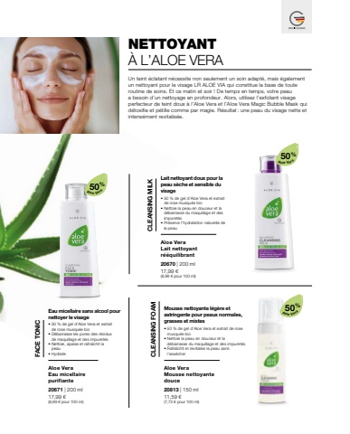 50%50%50%11,59 %u20ac(7,73 %u20ac pour 100 ml)17,99 %u20ac(8,99 %u20ac pour 100 ml)17,99 %u20ac(8,99 %u20ac pour 100 ml)20671 | 200 ml20670 | 200 ml20813 | 150 mlAloe VeraAloe VeraAloe VeraUn teint %u00e9clatant n%u00e9cessite non seulement un soin adapt%u00e9, mais %u00e9galement un nettoyant pour le visage LR%u00a0ALOE VIA qui constitue la base de toute routine de soins. Et ce matin et soir%u00a0! De temps en temps, votre peau a besoin d%u2019un nettoyage en profondeur. Alors, utilisez l%u2019exfoliant visage perfecteur de teint doux %u00e0 l%u2019Aloe Vera et l%u2019Aloe Vera Magic Bubble Mask qui d%u00e9toxifie et p%u00e9tille comme par magie. R%u00e9sultat : une peau du visage nette et intens%u00e9ment revitalis%u00e9e.NETTOYANT%u00c0 L%u2019ALOE VERAMousse nettoyante l%u00e9g%u00e8re et astringente pour peaux normales, grasses et mixtes CLEANSING FOAM%u2022 50%u00a0% de gel d%u2019Aloe Vera et extrait de rose musqu%u00e9e bio%u2022 Nettoie la peau en douceur et la d%u00e9barrasse du maquillage et des impuret%u00e9s%u2022 Rafra%u00eechit et revitalise la peau sans l%u2019ass%u00e9cherAloe VeraMousse nettoyantedouceLait nettoyant doux pour la peau s%u00e8che et sensible du visage CLEANSING MILK%u2022 50%u00a0% de gel d%u2019Aloe Vera et extrait de rose musqu%u00e9e bio%u2022 Nettoie la peau en douceur et la d%u00e9barrasse du maquillage et des impuret%u00e9s%u2022 Pr%u00e9serve l%u2019hydratation naturelle de la peauAloe VeraLait nettoyantr%u00e9%u00e9quilibrantEau micellaire sans alcool pour nettoyer le visage FACE TONIC%u2022 50%u00a0% de gel d%u2019Aloe Vera et extrait de rose musqu%u00e9e bio%u2022 D%u00e9barrasse les pores des r%u00e9sidus de maquillage et des impuret%u00e9s%u2022 Nettoie, apaise et rafra%u00eechit la peau%u2022 HydrateAloe VeraEau micellairepurifiante