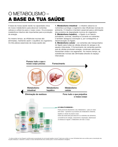 1 A colina contida no Liver Support contribui para a manuten%u00e7%u00e3o de uma fun%u00e7%u00e3o hep%u00e1tica normal. O alo%u00e9 vera contido no nosso Gel beb%u00edvel aloe vera contribui para a manuten%u00e7%u00e3o das fun%u00e7%u00f5es intestinais. A vitamina C contida no nosso Gel beb%u00edvel aloe vera contribui para o normal metabolismo energ%u00e9tico.Metabolismo intestinalMetabolismo hep%u00e1ticoMetabolismo celularFornecimentoPureza: tudo o que o nosso corpo precisaElimina%u00e7%u00e3o de res%u00edduos Fora: tudo o que prejudica o nosso corpoO METABOLISMO %u2013A BASE DA TUA SA%u00daDEA base da nossa sa%u00fade reside na capacidade %u00fanica do nosso metabolismo para absorver nutrientes valiosos e utiliz%u00e1-los para o nosso corpo. Os processos metab%u00f3licos intactos s%u00e3o importantes para a produ%u00e7%u00e3o de energia.Ao mesmo tempo, as influ%u00eancias nocivas s%u00e3o eliminadas, mantendo assim o equil%u00edbrio do organismo. Os tr%u00eas pilares essenciais da nossa sa%u00fade s%u00e3o:1. Metabolismo intestinal %u2013 o intestino absorve os nutrientes e protege o organismo das influ%u00eancias nocivas do ambiente. O intestino %u00e9 tamb%u00e9m essencial para a elimina%u00e7%u00e3o dos produtos de degrada%u00e7%u00e3o nocivos do organismo.2. Metabolismo hep%u00e1tico %u2013 o f%u00edgado %u00e9 um talento polivalente, controla, classifica e converte os nutrientes e tamb%u00e9m assegura a excre%u00e7%u00e3o e, por conseguinte, a desintoxica%u00e7%u00e3o do f%u00edgado.3. Metabolismo celular %u2013 os nutrientes s%u00e3o transportados do f%u00edgado para todas as c%u00e9lulas atrav%u00e9s do sangue e do espa%u00e7o intercelular. O fornecimento de nutrientes permite que as c%u00e9lulas produzam energia, construam estruturas, transmitam sinais e se regenerem. Ao mesmo tempo, as subst%u00e2ncias nocivas s%u00e3o eliminadas atrav%u00e9s do espa%u00e7o intercelular.LR HEALTH MISSION %u2013 Pode promover ativamente o seu metabolismo %u2013 para um maior bem-estar %u2013 apoiando os processos de metabolismo intestinal, hep%u00e1tico e celular do pr%u00f3prio corpo. Estes s%u00e3o essenciais para absorver os nutrientes dos alimentos, convert%u00ea-los em energia, crescimento e repara%u00e7%u00e3o, desintoxicar os res%u00edduos e regular o metabolismo de todo o corpo.