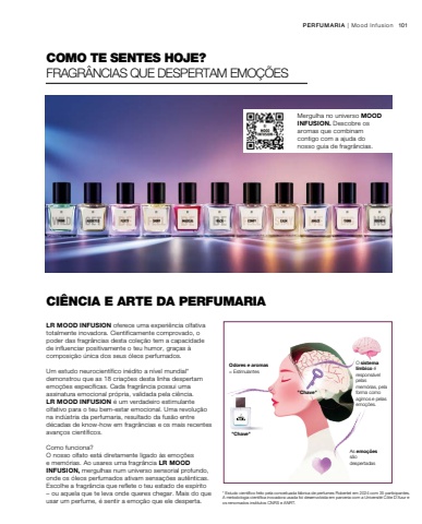 101 LR MOOD INFUSION oferece uma experi%u00eancia olfativa totalmente inovadora. Cientificamente comprovado, o poder das fragr%u00e2ncias desta cole%u00e7%u00e3o tem a capacidade de influenciar positivamente o teu humor, gra%u00e7as %u00e0 composi%u00e7%u00e3o %u00fanica dos seus %u00f3leos perfumados.Um estudo neurocient%u00edfico in%u00e9dito a n%u00edvel mundial* demonstrou que as 18 cria%u00e7%u00f5es desta linha despertam emo%u00e7%u00f5es espec%u00edficas. Cada fragr%u00e2ncia possui uma assinatura emocional pr%u00f3pria, validada pela ci%u00eancia. LR MOOD INFUSION %u00e9 um verdadeiro estimulante olfativo para o teu bem-estar emocional. Uma revolu%u00e7%u00e3o na ind%u00fastria da perfumaria, resultado da fus%u00e3o entre d%u00e9cadas de know-how em fragr%u00e2ncias e os mais recentes avan%u00e7os cient%u00edficos.Como funciona? O nosso olfato est%u00e1 diretamente ligado %u00e0s emo%u00e7%u00f5es e mem%u00f3rias. Ao usares uma fragr%u00e2ncia LR MOOD INFUSION, mergulhas num universo sensorial profundo, onde os %u00f3leos perfumados ativam sensa%u00e7%u00f5es aut%u00eanticas. Escolhe a fragr%u00e2ncia que reflete o teu estado de esp%u00edrito %u2013 ou aquela que te leva onde queres chegar. Mais do que usar um perfume, %u00e9 sentir a emo%u00e7%u00e3o que ele desperta.* Estudo cient%u00edfico feito pela conceituada f%u00e1brica de perfumes Robertet em 2024 com 35 participantes. A metodologia cient%u00edfica inovadora usada foi desenvolvida em parceria com a Universit%u00e9 C%u00f4te D'Azur e os renomados institutos CNRS e ANRT.CI%u00caNCIA E ARTE DA PERFUMARIAMergulha no universo MOOD INFUSION. Descobre os aromas que combinam contigo com a ajuda do nosso guia de fragr%u00e2ncias.PERFUMARIA | Mood InfusionCOMO TE SENTES HOJE?FRAGR%u00c2NCIAS QUE DESPERTAM EMO%u00c7%u00d5ESOdores e aromas= EstimulantesO sistema l%u00edmbico %u00e9 respons%u00e1vel pelas mem%u00f3rias, pela forma como agimos e pelas emo%u00e7%u00f5es.\As emo%u00e7%u00f5es s%u00e3o despertadas\