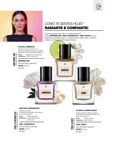 67.99 %u20ac67.99 %u20ac 67.99 %u20ac30706 | 50 ml30709 | 50 ml 30708 | 50 mlNotas arom%u00e1ticasDescobre a rainha que h%u00e1 em ti. Um perfume que irradia autoconfian%u00e7a, desperta admira%u00e7%u00e3o e n%u00e3o deixa ningu%u00e9m indiferente.FLORAL-ORIENTALBergamota, flor de laranjeira, baunilha, ylang ylangIMPRESS MEEau de Parfum para Ela IMPRESS MECOMO TE SENTES HOJE?RADIANTE E CONFIANTE!Queres impressionar com um charme incr%u00edvel?Ent%u00e3o IMPRESS ME, FEEL GORGEOUS e FEEL SHINY s%u00e3o as fragr%u00e2ncias perfeitas para ti. Criadas para te fazer sentir confiante, radiante e absolutamente deslumbrante.Notas arom%u00e1ticasCelebra a tua beleza.Um perfume que expressa a tua ess%u00eancia com leveza e eleg%u00e2ncia.FRUTADO-INSPIRADORLaranja sangu%u00ednea, groselha preta, pe%u00f4nia, cedro brancoFEEL GORGEOUSEau de Parfum para Ela FEEL GORGEOUSNotas arom%u00e1ticasSente-te confiante, vibrante e aut%u00eantica.Esta fragr%u00e2ncia foi criada para deixar o teu brilho natural falar por ti.FLORAL-ALMISCARADOP%u00eassego, jasmim, violeta, alm%u00edscarFEEL SHINYEau de Parfum para Ela FEEL SHINY