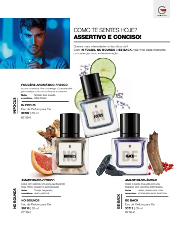 67.99 %u20ac67.99 %u20ac 67.99 %u20ac30702 | 50 ml30716 | 50 ml 30712 | 50 mlCOMO TE SENTES HOJE?ASSERTIVO E CONCISO!Queres mais intensidade no teu dia a dia? Com IN FOCUS, NO BOUNDS e BE BACK, vais viver cada momento com energia, foco e determina%u00e7%u00e3o.Notas arom%u00e1ticasAcorda os sentidos. Vive com energia. O perfume ideal para come%u00e7ar o dia com confian%u00e7a e entusiasmo.FOUG%u00c8RE-AROM%u00c1TICO-FRESCOAlm%u00edscar, lima, lavanda, notas frescasIN FOCUSEau de Parfum para Ele IN FOCUSNotas arom%u00e1ticasLidera com ess%u00eancia. Um aroma que transmite for%u00e7a interior, coragem e carisma natural.AMADEIRADO-C%u00cdTRICOToranja, bergamota, cedro, patchouliNO BOUNDSEau de Parfum para Ele NO BOUNDSNotas arom%u00e1ticasInspira o mundo %u00e0 tua volta com uma fragr%u00e2ncia para vision%u00e1rios determinados.AMADEIRADO-%u00c2MBARLim%u00e3o, pimenta rosa, notas amadeiradas secas, fava tonkaBE BACKEau de Parfum para Ele BE BACK