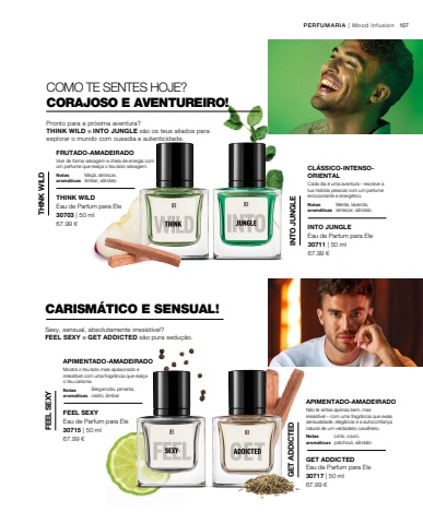107 67.99 %u20ac67.99 %u20ac67.99 %u20ac67.99 %u20ac30703 | 50 ml30715 | 50 ml30711 | 50 ml30717 | 50 mlPERFUMARIA | Mood InfusionCOMO TE SENTES HOJE?CORAJOSO E AVENTUREIRO!Pronto para a pr%u00f3xima aventura?THINK WILD e INTO JUNGLE s%u00e3o os teus aliados para explorar o mundo com ousadia e autenticidade.Notas arom%u00e1ticasVive de forma selvagem e cheia de energia com um perfume que real%u00e7a o teu lado selvagem.FRUTADO-AMADEIRADOMa%u00e7%u00e3, alm%u00edscar, %u00e2mbar, s%u00e2ndaloTHINK WILDEau de Parfum para Ele THINK WILDNotas arom%u00e1ticasCada dia %u00e9 uma aventura%u00a0%u2013 escreve a tua hist%u00f3ria pessoal com um perfume emocionante e energ%u00e9tico.CL%u00c1SSICO-INTENSOORIENTALMenta, lavanda, alm%u00edscar, s%u00e2ndaloINTO JUNGLEEau de Parfum para Ele INTO JUNGLENotas arom%u00e1ticasN%u00e3o te sintas apenas bem, mas irresist%u00edvel%u00a0%u2013 com uma fragr%u00e2ncia que exala sensualidade, eleg%u00e2ncia e a autoconfian%u00e7a natural de um verdadeiro cavalheiro.APIMENTADO-AMADEIRADOLima, couro, patchouli, s%u00e2ndaloGET ADDICTEDEau de Parfum para Ele GET ADDICTEDNotas arom%u00e1ticasMostra o teu lado mais apaixonado e irresist%u00edvel com uma fragr%u00e2ncia que real%u00e7a o teu carisma.APIMENTADO-AMADEIRADOBergamota, pimenta, cedro, %u00e2mbarFEEL SEXYEau de Parfum para Ele FEEL SEXYCARISM%u00c1TICO E SENSUAL!Sexy, sensual, absolutamente irresist%u00edvel?FEEL SEXY e GET ADDICTED s%u00e3o pura sedu%u00e7%u00e3o.