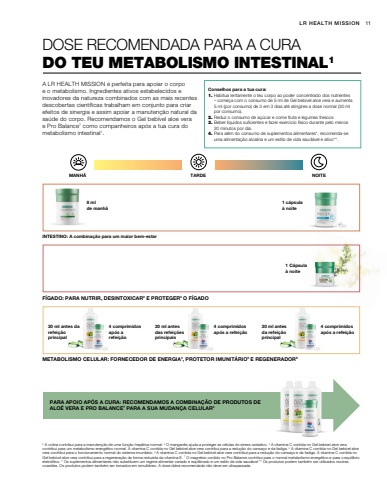 MORGENS MITTAGS ABENDS11 2 A colina contribui para a manuten%u00e7%u00e3o de uma fun%u00e7%u00e3o hep%u00e1tica normal. 3 O mangan%u00eas ajuda a proteger as c%u00e9lulas do stress oxidativo. 4 A vitamina C contida no Gel beb%u00edvel aloe vera contribui para um metabolismo energ%u00e9tico normal. A vitamina C contida no Gel beb%u00edvel aloe vera contribui para a redu%u00e7%u00e3o do cansa%u00e7o e da fadiga. 5 A vitamina C contida no Gel beb%u00edvel aloe vera contribui para o funcionamento normal do sistema imunit%u00e1rio. 6 A vitamina C contida no Gel beb%u00edvel aloe vera contribui para a redu%u00e7%u00e3o do cansa%u00e7o e da fadiga. A vitamina C contida no Gel beb%u00edvel aloe vera contribui para a regenera%u00e7%u00e3o da forma reduzida da vitamina E. 7 O magn%u00e9sio contido no Pro Balance contribui para o normal metabolismo energ%u00e9tico e para o equil%u00edbrio eletrol%u00edtico. * Os suplementos alimentares n%u00e3o substituem um regime alimentar variado e equilibrado e um estilo de vida saud%u00e1vel ** Os produtos podem tamb%u00e9m ser utilizados noutras ocasi%u00f5es. Os produtos podem tamb%u00e9m ser tomados em simult%u00e2neo. A dose di%u00e1ria recomendada n%u00e3o deve ser ultrapassada. LR HEALTH MISSION Conselhos para a tua cura:1. Habitua lentamente o teu corpo ao poder concentrado dos nutrientes %u2013 come%u00e7a com o consumo de 5 ml de Gel beb%u00edvel aloe vera e aumenta 5%u00a0ml (por consumo) de 3 em 3 dias at%u00e9 atingires a dose normal (30%u00a0ml por consumo). 2. Reduz o consumo de a%u00e7%u00facar e come fruta e legumes frescos 3. Beber l%u00edquidos suficientes e fazer exerc%u00edcio f%u00edsico durante pelo menos 20%u00a0minutos por dia.4. Para al%u00e9m do consumo de suplementos alimentares*, recomenda-se uma alimenta%u00e7%u00e3o alcalina e um estilo de vida saud%u00e1vel e ativo**.PARA APOIO AP%u00d3S A CURA: RECOMENDAMOS A COMBINA%u00c7%u00c3O DE PRODUTOS DE ALO%u00c9 VERA E PRO BALANCE7 PARA A SUA MUDAN%u00c7A CELULAR4F%u00cdGADO: PARA NUTRIR, DESINTOXICAR2 E PROTEGER3 O F%u00cdGADOMETABOLISMO CELULAR: FORNECEDOR DE ENERGIA4, PROTETOR IMUNIT%u00c1RIO5 E REGENERADOR6INTESTINO: A combina%u00e7%u00e3o para um maior bem-estar1 c%u00e1psula%u00e0 noite1 C%u00e1psula%u00e0 noite30%u00a0ml antes da refei%u00e7%u00e3o principal4 comprimidos ap%u00f3s a refei%u00e7%u00e3oMANH%u00c38 mlde manh%u00e330%u00a0ml antes das refei%u00e7%u00f5es principais4 comprimidos ap%u00f3s a refei%u00e7%u00e3o30%u00a0ml antes da refei%u00e7%u00e3o principal4 comprimidos ap%u00f3s a refei%u00e7%u00e3oDOSE RECOMENDADA PARA A CURA DO TEU METABOLISMO INTESTINAL1A LR%u00a0HEALTH MISSION %u00e9 perfeita para apoiar o corpo e o metabolismo. Ingredientes ativos estabelecidos e inovadores da natureza combinados com as mais recentes descobertas cient%u00edficas trabalham em conjunto para criar efeitos de sinergia e assim apoiar a manuten%u00e7%u00e3o natural da sa%u00fade do corpo. Recomendamos o Gel beb%u00edvel aloe vera e Pro Balance7 como companheiros ap%u00f3s a tua cura do metabolismo intestinal1.TARDE NOITE