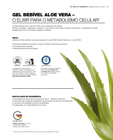 WWW.IASC.ORG WWW.SGS-QUALITAETSSIEGEL.DE/EN WWW.KOELNERLISTE.COM13 %u201cMade in Germany%u201d %u00e9 a nossa promessa de qualidadena qual pode confiar a 100%.Os G%u00e9is aloe Vera da LR%u00a0LIFETAKT fazem parte da Cologne List%u00ae. A%u00a0Cologne List%u00ae publica produtos com um risco de dopagem minimizado.A qualidade %u00e9 a nossa principal prioridade. Desde o processamento da mat%u00e9ria-prima at%u00e9 ao produto final %u2013 tudo na LR%u00a0est%u00e1 sujeito a controlos rigorosos. Este facto %u00e9 confirmado pelos certificados SGS Institut Fresenius e IASC.LR HEALTH MISSION | Metabolismo celular%u00daNICOMUITOS ANOS DE EXPERI%u00caNCIA1 A vitamina C contida no Gel beb%u00edvel aloe vera contribui para o normal metabolismo energ%u00e9tico. GEL BEB%u00cdVEL ALOE VERA %u2013O ELIXIR PARA O METABOLISMO CELULAR%u00b9Os g%u00e9is beb%u00edveis aloe vera da LR%u00a0t%u00eam uma vasta gama de efeitos:Nutrem, protegem, regeneram e apoiam o corpo para o bem-estar. Apoiam eficazmente o metabolismo celular1, assegurando que os nutrientes chegam %u00e0s c%u00e9lulas.Apenas os G%u00e9is beb%u00edveis aloe vera receberam o selo SGS Institut Fresenius e o selo IASC:%u2022 Elevada qualidade do produto: a partir do filete de folhas de alo%u00e9 vera%u2022 Processamento delicado%u2022 Elevados padr%u00f5es de produ%u00e7%u00e3o%u2022 Especialista em aloe vera h%u00e1 mais de 20 anos %u2013 %u201cMade in Germany%u201d%u2022 Uma das mais modernas instala%u00e7%u00f5es de produ%u00e7%u00e3o de aloe vera na Alemanha%u2022 Controlos de qualidade internos normalizados%u2022 Coopera%u00e7%u00e3o com especialistas de renome