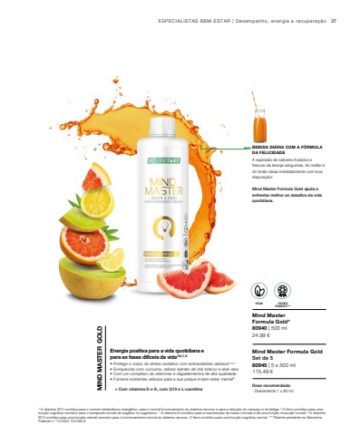 ZUM PATENTANGEMELDETVEGAN27 24.99 %u20ac115.49 %u20ac80940 | 500 ml80945 | 5 x 500 ml5 A vitamina B12 contribui para o normal metabolismo energ%u00e9tico, para o normal funcionamento do sistema nervoso e para a redu%u00e7%u00e3o do cansa%u00e7o e da fadiga. 6 O ferro contribui para uma fun%u00e7%u00e3o cognitiva normal e para o transporte normal de oxig%u00e9nio no organismo. 7 A vitamina D contribui para a manuten%u00e7%u00e3o de ossos normais e de uma fun%u00e7%u00e3o muscular normal. 8 A vitamina B12 contribui para uma fun%u00e7%u00e3o mental normal e para o funcionamento normal do sistema nervoso. O ferro contribui para uma fun%u00e7%u00e3o cognitiva normal. *** Patente pendente na Alemanha. Patente n.%u00ba 10 2023 123 064.6ESPECIALISTAS BEM-ESTAR | Desempenho, energia e recupera%u00e7%u00e3oBEBIDA DI%u00c1RIA COM A F%u00d3RMULA DA FELICIDADEA explos%u00e3o de sabores frutados e frescos da laranja sangu%u00ednea, do mel%u00e3o e do lim%u00e3o deixa imediatamente com boa disposi%u00e7%u00e3o! Mind Master Formula Gold ajuda a enfrentar melhor os desafios da vida quotidiana.VEGAN PATENTE PENDENTE***Dose recomendada: %u2219 Diariamente 1 x 80 mlMind MasterFormula Gold*Mind Master Formula GoldSet de 5%u2022 Protege o corpo do stress oxidativo com antioxidantes valiosos2,5,6,7%u2022 Enriquecido com curcuma, valioso extrato de ch%u00e1 branco e alo%u00e9 vera%u2022 Com um complexo de vitaminas e oligoelementos de alta qualidade %u2022 Fornece nutrientes valiosos para a sua psique e bem-estar mental8 MIND MASTER GOLD+ Com vitamina D e K, com Q10 e L-carnitinaEnergia positiva para a vida quotidiana e para as fases dif%u00edceis da vida5,6,7, 8