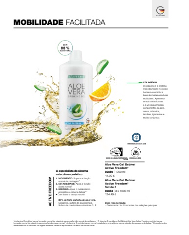 WWW.SGS-QUALITAETSSIEGEL.DE/ENWWW.IASC.ORGWWW.KOELNERLISTE.COM44.99 %u20ac124.49 %u20ac80850 | 1000 ml80883 | 3 x 1000 ml1A vitamina C contribui para a forma%u00e7%u00e3o normal de colag%u00e9nio para uma fun%u00e7%u00e3o normal da cartilagem. 2 A vitamina C contida no Gel Beb%u00edvel Aloe Vera Active Freedom contribui para a forma%u00e7%u00e3o normal de colag%u00e9nio para uma fun%u00e7%u00e3o %u00f3ssea normal. 3 A vitamina C contribui para o normal metabolismo energ%u00e9tico e para a redu%u00e7%u00e3o do cansa%u00e7o e da fadiga. * Os suplementos alimentares n%u00e3o substituem um regime alimentar variado e equilibrado e um estilo de vida saud%u00e1vel.COM88 % ALOE VERADose recomendada: %u2219 Diariamente: 3 x 30%u00a0ml antes das refei%u00e7%u00f5es principais1. MOVIMENTO: Suporta a fun%u00e7%u00e3o normal da cartilagem52. ESTABILIDADE: Apoia a fun%u00e7%u00e3o %u00f3ssea normal63. ENERGIA: Apoia o metabolismo energ%u00e9tico e reduz a fadiga4, 7%u2022 Com sabor a laranja natural88% de filete da folha de aloe vera,Colag%u00e9nio, sulfato de glucosamina, ACTIVE FREEDOMSulfato de condroitina e vitaminas C, EO especialista do sistema m%u00fasculo-esquel%u00e9ticoAloe Vera Gel Beb%u00edvelActive Freedom*Set de 3Aloe Vera Gel Beb%u00edvelActive Freedom*COLAG%u00c9NIOO colag%u00e9nio %u00e9 a prote%u00edna mais abundante no corpo humano e constitui a base de muitas estruturas tecidulares. Apresentase sob v%u00e1rias formas e %u00e9 um dos principais componentes da pele, ossos, m%u00fasculos, tend%u00f5es, ligamentos e tecido conjuntivo.MOBILIDADE FACILITADA