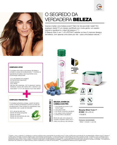 LAKTOSEFREIZUCKERFREI+ 179.99 %u20ac81030 | 30 x 25 ml1A biotina, o zinco, a vitamina A, a riboflavina e a niacina contribuem para a manuten%u00e7%u00e3o de uma pele normal. O cobre contribui para a manuten%u00e7%u00e3o de uma pigmenta%u00e7%u00e3o cut%u00e2nea normal. A vitamina C contribui para a forma%u00e7%u00e3o normal de colag%u00e9nio para o funcionamento normal da pele. 2 O cobre contribui para a manuten%u00e7%u00e3o de um tecido conjuntivo normal. 3 A biotina e o zinco contribuem para a manuten%u00e7%u00e3o de um cabelo normal. O cobre contribui para a manuten%u00e7%u00e3o da pigmenta%u00e7%u00e3o normal do cabelo. 4 O zinco contribui para a manuten%u00e7%u00e3o de unhas normais. 5 A vitamina E contribui para a prote%u00e7%u00e3o das c%u00e9lulas contra o stress oxidativo. A tiamina contribui para o normal metabolismo energ%u00e9tico. As vitaminas B6 e B12 contribuem para a redu%u00e7%u00e3o do cansa%u00e7o e da fadiga. * Os suplementos alimentares n%u00e3o substituem um regime alimentar variado e equilibrado e um estilo de vida saud%u00e1vel. ** da quantidade de refer%u00eancia para a ingest%u00e3o di%u00e1ria. O SEGREDO DA VERDADEIRA BELEZAQueres irradiar uma beleza jovem? Sem ter de esconder nada? Em qualquer idade? %u00c9 um desejo partilhado por muita gente: um aspeto natural e saud%u00e1vel %u00e9 o ideal de beleza n.%u00ba 1. O Beauty Elixir 5 em 1 LR%u00a0LIFETAKT satisfaz os teus 5 maiores desejos de beleza, com apenas uma dose por dia %u2013 para uma beleza natural.1%u20135COMPLEXO ATIVOO complexo ativo ativa os processos de beleza e combate os sinais de envelhecimento.1-5 Combina os ingredientes de beleza mais importantes numa concentra%u00e7%u00e3o selecionada:%u2219 2,5 g de p%u00e9ptidos de colag%u00e9nio%u2219 50 mg de %u00e1cido hialur%u00f3nico%u2219 Cobre precioso%u2219 Zinco eficaz%u2219 Alto teor de 9 vitaminas: 100 % vitamina E, tiamina, riboflavina, niacina, B6, biotina, B12, vitamina C por dose di%u00e1ria** e 75 % de vitamina A por dose di%u00e1ria**COMPLEXO PREVENTIVOO complexo preventivo protege, a partir de dentro, contra os fatores ambientais e previne os sinais de envelhecimento. Este combina os ingredientes mais importantes com o poder da natureza:%u2219 20 % de gel de alo%u00e9 vera%u2219 Extrato de laranja sangu%u00ednea%u2219 Extrato de mirtilo%u2219 Extrato de erva-pinheira de rosa%u2219 Extrato de ch%u00e1 verdeSEM LACTOSE SEM GL%u00daTENSEM A%u00c7%u00daCAR SEM CORANTES ARTIFICIAISConsumo recomendado: %u2219 Beber 1 ampola 1 x por diaBeauty Elixir 5 em 1* 1. Uma apar%u00eancia jovem e com menos rugas12. Uma pele bonita13. Um tecido conjuntivo saud%u00e1vel24. Um cabelo forte e brilhante35. Unhas fortes e saud%u00e1veis4Modo de a%u00e7%u00e3o %u00fanico gra%u00e7as ao inovador complexo duplo com o BEAUTY ELIXIR 5 EM 1melhor da ci%u00eancia e da naturezaBELEZA JOVEM DA CABE%u00c7A AOS P%u00c9S