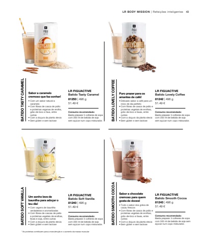 43 51.49 %u20ac 51.49 %u20ac51.49 %u20ac 51.49 %u20ac81250 | 496 g 81242 | 496 g81240 | 496 g 81243 | 496 g*As prote%u00ednas contribuem para a manuten%u00e7%u00e3o e o aumento da massa muscularLR BODY MISSION | Refei%u00e7%u00f5es inteligentesConsumo recomendado: Basta preparar 3 colheres de sopa com 300 ml de bebida de soja sem a%u00e7%u00facar num copo misturador.LR FIGUACTIVEBatido Tasty CaramelConsumo recomendado: Basta preparar 3 colheres de sopa com 300 ml de bebida de soja sem a%u00e7%u00facar num copo misturador.LR FIGUACTIVEBatido Lovely CoffeeConsumo recomendado: Basta preparar 3 colheres de sopa com 300 ml de bebida de soja sem a%u00e7%u00facar num copo misturador.LR FIGUACTIVEBatido Soft VanillaConsumo recomendado: Basta preparar 3 colheres de sopa com 300 ml de bebida de soja sem a%u00e7%u00facar num copo misturador.LR FIGUACTIVEBatido Smooth Cocoa%u2022 Com um sabor natural a caramelo%u2022 Com fibras de casca de ps%u00edlio e prote%u00ednas veganas de ervilha, gr%u00e3o-de-bico e fava, entre outras%u2022 Com a do%u00e7ura da planta stevia BATIDO TASTY CARAMEL%u2022 Sem gl%u00faten e sem lactoseSabor a caramelo cremoso que faz sonhar!%u2022 Delicado sabor a caf%u00e9 para um in%u00edcio de dia perfeito%u2022 Com fibras de casca de ps%u00edlio e prote%u00ednas vegetais de ervilhas, gr%u00e3o-de-bico e favas, entre outras%u2022 Com a do%u00e7ura da planta stevia BATIDO LOVELY COFFEE%u2022 Sem gl%u00faten e sem lactosePuro prazer para os amantes de caf%u00e9!%u2022 Com vagens de baunilha verdadeiras e aromatizadas%u2022 Com fibras de cascas de ps%u00edlio e prote%u00ednas vegetais de ervilhas, favas e soja, entre outras%u2022 Com a do%u00e7ura da planta stevia BATIDO SOFT VANILLA%u2022 Sem gl%u00faten e sem lactoseUm sonho leve de baunilha para ado%u00e7ar o teu dia! %u2022 Todo o sabor dos gr%u00e3os de cacau frescos%u2022 Com fibras de casca de ps%u00edlio e prote%u00ednas vegetais de ervilhas, gr%u00e3o-de-bico e favas, entre outras%u2022 Com a do%u00e7ura da planta stevia BATIDO SMOOTH COCOA%u2022 Sem gl%u00faten e sem lactoseSabor a chocolate cremoso para quem gosta de doces!