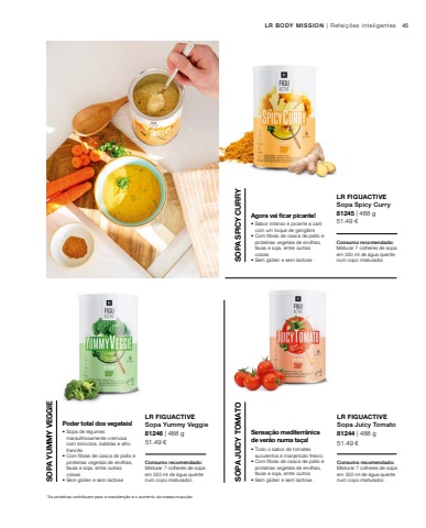 45 51.49 %u20ac51.49 %u20ac 51.49 %u20ac81246 | 488 g 81244 | 488 g81245 | 488 g*As prote%u00ednas contribuem para a manuten%u00e7%u00e3o e o aumento da massa muscularLR BODY MISSION | Refei%u00e7%u00f5es inteligentesConsumo recomendado: Misturar 7 colheres de sopa em 350 ml de %u00e1gua quente num copo misturador.LR FIGUACTIVESopa Yummy Veggie Consumo recomendado: Misturar 7 colheres de sopa em 350 ml de %u00e1gua quente num copo misturador.LR FIGUACTIVESopa Juicy Tomato%u2022 Sopa de legumes maravilhosamente cremosa com br%u00f3colos, batatas e alho franc%u00eas %u2022 Com fibras de casca de ps%u00edlio e prote%u00ednas vegetais de ervilhas, favas e soja, entre outras coisas SOPA YUMMY VEGGIE%u2022 Sem gl%u00faten e sem lactosePoder total dos vegetais!%u2022 Todo o sabor de tomates suculentos e manjeric%u00e3o fresco%u2022 Com fibras de casca de ps%u00edlio e prote%u00ednas vegetais de ervilhas, favas e soja, entre outros SOPA JUICY TOMATO%u2022 Sem gl%u00faten e sem lactoseSensa%u00e7%u00e3o mediterr%u00e2nica de ver%u00e3o numa ta%u00e7a!Consumo recomendado: Misturar 7 colheres de sopa em 350 ml de %u00e1gua quente num copo misturador. LR FIGUACTIVESopa Spicy Curry%u2022 Sabor intenso e picante a caril com um toque de gengibre%u2022 Com fibras de casca de ps%u00edlio e prote%u00ednas vegetais de ervilhas, favas e soja, entre outras coisas SOPA SPICY CURRY%u2022 Sem gl%u00faten e sem lactoseAgora vai ficar picante!