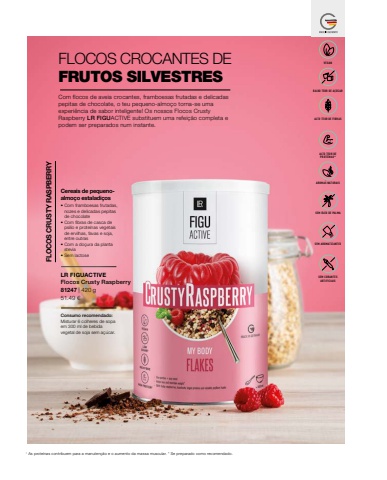 VEGAN ZUCKERFREIBALLASTSTOFFQUELLEHOHERPROTEINGEHALTNAT%u00dcRLICHEAROMENFREI VONGESCHMACKSVERST%u00c4RKERNFREI VONPALM%u00d6L51.49 %u20ac81247 | 420 g1 As prote%u00ednas contribuem para a manuten%u00e7%u00e3o e o aumento da massa muscular. * Se preparado como recomendado.FLOCOS CROCANTES DE FRUTOS SILVESTRESCom flocos de aveia crocantes, framboesas frutadas e delicadas pepitas de chocolate, o teu pequeno-almo%u00e7o torna-se uma experi%u00eancia de sabor inteligente! Os nossos Flocos Crusty Raspberry LR%u00a0FIGUACTIVE substituem uma refei%u00e7%u00e3o completa e podem ser preparados num instante.Consumo recomendado: Misturar 6 colheres de sopa em 300 ml de bebida vegetal de soja sem a%u00e7%u00facar.LR FIGUACTIVEFlocos Crusty Raspberry%u2022 Com framboesas frutadas, nozes e delicadas pepitas de chocolate%u2022 Com fibras de casca de ps%u00edlio e prote%u00ednas vegetais de ervilhas, favas e soja, entre outras%u2022 Com a do%u00e7ura da planta stevia%u2022 Sem lactose FLOCOS CRUSTY RASPBERRYCereais de pequenoalmo%u00e7o estaladi%u00e7osVEGANBAIXO TEOR DE A%u00c7%u00daCARALTO TEOR DE FIBRASALTO TEOR DE PROTE%u00cdNAS*AROMAS NATURAISSEM %u00d3LEO DE PALMASEM AROMATIZANTESSEM CORANTES ARTIFICIAIS