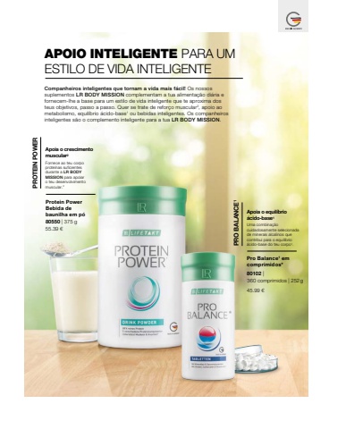 55.39 %u20ac45.99 %u20ac80550 | 375 g80102 |APOIO INTELIGENTE PARA UM ESTILO DE VIDA INTELIGENTECompanheiros inteligentes que tornam a vida mais f%u00e1cil! Os nossos suplementos LR%u00a0BODY MISSION complementam a tua alimenta%u00e7%u00e3o di%u00e1ria e fornecem-lhe a base para um estilo de vida inteligente que te aproxima dos teus objetivos, passo a passo. Quer se trate de refor%u00e7o muscular2, apoio ao metabolismo, equil%u00edbrio %u00e1cido-base1 ou bebidas inteligentes. Os companheiros inteligentes s%u00e3o o complemento inteligente para a tua LR%u00a0BODY MISSION.Protein PowerBebida de baunilha em p%u00f3Fornece ao teu corpo prote%u00ednas suficientes durante a LR%u00a0BODY MISSION para apoiar o teu desenvolvimento muscular. PROTEIN POWER2Apoia o crescimento muscular2Pro Balance1 em comprimidos*Uma combina%u00e7%u00e3o cuidadosamente selecionada de minerais alcalinos que contribui para o equil%u00edbrio %u00e1cido-base do teu corpo1 PRO BALANCE.1Apoia o equil%u00edbrio %u00e1cido-base1360 comprimidos | 252g