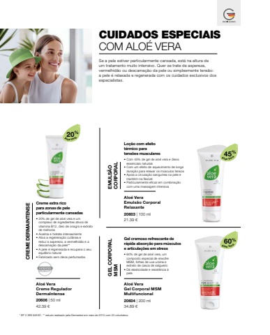 *20%45%60%21.39 %u20ac42.39 %u20ac 34.89 %u20ac20606 | 50 ml20603 | 100 ml20604 | 200 ml* EP 2 399 648 B1. ** estudo realizado pela Dermatest em maio de 2010 com 20 volunt%u00e1rios.Aloe VeraAloe VeraAloe VeraCUIDADOS ESPECIAISCOM ALO%u00c9 VERASe a pele estiver particularmente cansada, est%u00e1 na altura de um tratamento muito intensivo. Quer se trate de aspereza, vermelhid%u00e3o ou descama%u00e7%u00e3o da pele ou simplesmente tens%u00e3o: a pele %u00e9 relaxada e regenerada com os cuidados exclusivos dos especialistas.Alo%u00e9 VeraCreme ReguladorDermaIntense%u2022 20% de gel de alo%u00e9 vera e um complexo de ingredientes ativos de vitamina B12, %u00f3leo de onagra e extrato de mahonia%u2022 Acalma e hidrata intensamente%u2022 Ativa a regenera%u00e7%u00e3o cut%u00e2nea e reduz a aspereza, a vermelhid%u00e3o e a descama%u00e7%u00e3o da pele**%u2022 A pele %u00e9 regenerada e recupera o seu equil%u00edbrio natural CREME DERMAINTENSE%u2022 Fabricado sem %u00f3leos perfumadosCreme extra ricopara zonas de pele particularmente cansadasAlo%u00e9 Vera Emuls%u00e3o CorporalRelaxante%u2022 Com 45% de gel de alo%u00e9 vera e %u00f3leos essenciais naturais%u2022 Com um efeito de aquecimento de longa dura%u00e7%u00e3o para relaxar os m%u00fasculos tensos%u2022 Apoia a circula%u00e7%u00e3o sangu%u00ednea na pele e mant%u00e9m-na flex%u00edvel%u2022 Particularmente eficaz em combina%u00e7%u00e3o EMULS%u00c3O CORPORALcom uma massagem intensivaLo%u00e7%u00e3o com efeito t%u00e9rmico para tens%u00f5es muscularesAlo%u00e9 VeraGel Corporal MSMMultifuncional%u2022 60% de gel de alo%u00e9 vera, um composto especial de enxofre MSM, folhas de uva-ursina e extrato de casca de salgueiro%u2022 D%u00e1 elasticidade e resist%u00eancia %u00e0 GEL CORPORAL MSMpeleGel cremoso refrescante de r%u00e1pida absor%u00e7%u00e3o para m%u00fasculos e articula%u00e7%u00f5es em stress