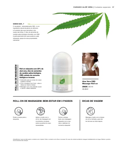 57 30.89 %u20ac20826 | 50 mlAdvert%u00eancias: Lavar as m%u00e3os ap%u00f3s o contacto com o l%u00edquido. Evitar o contacto com olhos e mucosas. Em caso de contacto acidental, enxaguar imediatamente com %u00e1gua. Manter o produto fora do alcance das crian%u00e7as.SABIAS QUE...?ROLL-ON DE MASSAGEM: BEM-ESTAR EM 3 PASSOS DICAS DE VIAGEMRodar a tampa para a esquerda.Aplicar a lo%u00e7%u00e3o com o roll-on de massagem em movimentos circulares sobre as partes do corpo necessitadas.Fechar a tampa, fazer uma massagem relaxante com a sua m%u00e3o e desfrutar do momento relaxante!Massajar a lo%u00e7%u00e3o com a tampa do roll-on fechado, para n%u00e3o ter de lavar as m%u00e3os depois.CUIDADO ALO%u00c9 VERA | Cuidados especiaisO canabidiol %u2013 abreviadamente CBD %u2013 %u00e9 um ingrediente natural da planta do c%u00e2nhamo e %u00e9 extra%u00eddo das suas sementes e dos caules das folhas. O %u00f3leo de sementes de can%u00e1bis sativa biol%u00f3gica infundido com CBD %u00e9 particularmente bom para acalmar a pele stressada, gra%u00e7as %u00e0s suas propriedades calmantes. %u2022 Calmante para as zonas do corpo sujeitas a tens%u00e3o%u2022 Com complexo Hot-Cold %u2013 ativa e relaxa ao mesmo tempo%u2022 Massajar com uma press%u00e3o suave e sentir o efeito relaxante ROLL-ON DE MASSAGEMRoll-on relaxante com 20% de alo%u00e9 vera, %u00f3leo de sementes de can%u00e1bis sativa biol%u00f3gica, CBD, extrato de curcuma biol%u00f3gica e incensoAloe Vera CBDMassage-Roll-on
