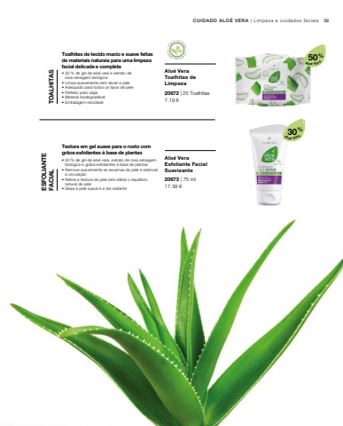B IO DE G R A DA B L E50%30%59 7.19 %u20ac17.39 %u20ac20672 |20673 | 75 mlCUIDADO ALO%u00c9 VERA | Limpeza e cuidados faciaisAloe VeraAloe VeraAlo%u00e9 VeraToalhitas de Limpeza %u2022 30 % de gel de alo%u00e9 vera e extrato de rosa selvagem biol%u00f3gica%u2022 Limpa suavemente sem secar a pele%u2022 Adequado para todos os tipos de pele%u2022 Perfeito para viajar%u2022 Material biodegrad%u00e1vel TOALHITAS%u2022 Embalagem recicl%u00e1velToalhitas de tecido macio e suave feitas de materiais naturais para uma limpeza facial delicada e completaAlo%u00e9 VeraEsfoliante FacialSuavizante%u2022 50 % de gel de alo%u00e9 vera, extrato de rosa selvagem biol%u00f3gica e gr%u00e3os esfoliantes %u00e0 base de plantas %u2022 Remove suavemente as escamas da pele e estimula a circula%u00e7%u00e3o%u2022 Refina a textura da pele sem afetar o equil%u00edbrio natural da pele ESFOLIANTE FACIAL%u2022 Deixa a pele suave e a tez radianteTextura em gel suave para o rosto com gr%u00e3os esfoliantes %u00e0 base de plantas 25 Toalhitas