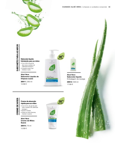 35%38%63 12.69 %u20ac 17.89 %u20ac12.69 %u20ac20611 | 250 ml 20612 | 500 ml20610 | 75 mlCUIDADO ALO%u00c9 VERA | Limpeza e cuidados corporaisAloe VeraAloe VeraAlo%u00e9 VeraSabonete L%u00edquido de limpeza suaveAlo%u00e9 VeraSabonete l%u00edquidoEmbalagem de recargaAlo%u00e9 VeraCreme de M%u00e3os Suave%u2022 Com 38% de gel de alo%u00e9 vera e extrato de cal%u00eandula biol%u00f3gico%u2022 Limpeza suave que SABONETE PARA AS M%u00c3OShidrata e nutreSabonete l%u00edquido hidratante para as m%u00e3os%u2022 Com 35 % de gel de alo%u00e9 vera e extrato de cal%u00eandula biol%u00f3gico%u2022 Nutre e hidrata%u2022 Deixa as m%u00e3os flex%u00edveis, CREME DE M%u00c3OSmacias e suavesCreme de absor%u00e7%u00e3o r%u00e1pida para as m%u00e3os