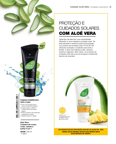 15%69 17.89 %u20ac20436 | 250 mlGarante uma conjuga%u00e7%u00e3o eficaz de prote%u00e7%u00e3o contra os filtros UVA e UVBOS PRODUTOS DE PROTE%u00c7%u00c3O SOLAR LR%u00a0ALOE VIA S%u00c3O EMBALADOS MESMO ANTES DOS MESES MAIS SOALHEIROS DE VER%u00c3O.CUIDADO ALO%u00c9 VERA | Cuidados masculinosAloe VeraAlo%u00e9 VeraLimpeza de corpo, rosto, cabelo e barba 4 em 1%u2022 Com 15% de alo%u00e9 vera e extrato de baob%u00e1 biol%u00f3gico%u2022 Limpa a pele, o cabelo e a barba de forma suave e segura%u2022 Elimina res%u00edduos de influ%u00eancias ambientais e odores%u2022 Hidrata a pele e o cabelo GEL DE LIMPEZA 4 EM 1Limpeza completa para todo o corpoPROTE%u00c7%u00c3O E CUIDADOS SOLARESCOM ALO%u00c9 VERACada tipo de pele tem uma necessidade diferente no que respeita %u00e0 prote%u00e7%u00e3o solar. Da pele delicada e sens%u00edvel %u00e0 pele j%u00e1 bronzeada, os produtos de prote%u00e7%u00e3o solar LR%u00a0ALOE VIA oferecem prote%u00e7%u00e3o e cuidados para toda a fam%u00edlia. O alo%u00e9 vera hidrata a pele, refresca, acalma e regenera. Al%u00e9m disso, os produtos de prote%u00e7%u00e3o solar s%u00e3o %u00e0 prova de %u00e1gua e totalmente isentos de corantes!