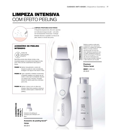 ANWENDUNG:GESICHT77 88.99 %u20ac25.59 %u20ac7010428001 | 200 mlCUIDADO ANTI-IDADE | Dispositivo Cosm%u00e9tico ZONA DE APLICA%u00c7%u00c3O:ROSTORemo%u00e7%u00e3o precisa das c%u00e9lulas mortas e das impurezas gra%u00e7as %u00e0 inovadora tecnologia de ultrasons. Para uma tez visivelmente mais suave e fresca.PASSO 1: Aplicar manualmente o creme de limpeza na pele do rosto humedecida, enxaguar com %u00e1gua e n%u00e3o secar o rosto.PASSO 2: Ligar o aparelho e deslizar suavemente a esp%u00e1tula met%u00e1lica num %u00e2ngulo de 45%u00b0 sobre o rosto bem humedecido durante um m%u00e1ximo de 3 minutos. Proceder sempre de dentro para fora e de baixo para cima.PASSO 3: Aplicar o t%u00f3nico com um disco de limpeza. Este t%u00f3nico acalma e refor%u00e7a a barreira cut%u00e2nea ap%u00f3s o tratamento de peeling.ACESS%u00d3RIO DE PEELINGINTENSIVOLIMPEZA INTENSIVA COM EFEITO PEELINGLIMPEZA PROFUNDA DOS POROSA frequ%u00eancia especial dos ultra-sons vaporiza as mol%u00e9culas de %u00e1gua da pele %u2013 uma s%u00e9rie de microimplos%u00f5es min%u00fasculas. A energia libertada dissolve a sujidade e os flocos de pele, mesmo no fundo dos poros.Acess%u00f3rio de peeling facial**Acess%u00f3rio de peeling por cavita%u00e7%u00e3o para utiliza%u00e7%u00e3o com ACESS%u00d3RIO DE PEELING FACIAL **%u00e1guaPremiumT%u00f3nico facialClarifica e acalma a pele ap%u00f3s o tratamento com a escova de limpeza ou o peeling de cavita%u00e7%u00e3o. Refor%u00e7a a fun%u00e7%u00e3o protetora natural da pele com PCA de zinco, alanto%u00edna e pantenol e tem um efeito revitalizante gra%u00e7as ao extrato de harungana. A f%u00f3rmula sem %u00e1lcool %u00e9 adequada para todos os tipos de pele e restaura T%u00d3NICO FACIALo valor natural do pH da pele.