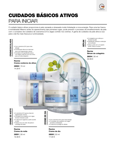 14.29 %u20ac32.89 %u20ac19.39 %u20ac 17.29 %u20ac28502 | 15 ml28501 | 50 ml 28500 | 50 ml28504 | 30 mlRacineCreme contorno de olhos%u2022 Com coenzima Q10 para mais energia %u2022 Combina%u00e7%u00e3o eficaz de vitaminas para uma regenera%u00e7%u00e3o natural%u2022 Complexo de ingredientes ativos com algas cuida da zona dos olhos CREME DE OLHOSpara um olhar despertoRacineCreme de noite%u2022 A coenzima Q10 apoia a fase de regenera%u00e7%u00e3o noturna%u2022 Complexo de cuidados com algas fornece minerais %u00e0 pele%u2022 A vitamina E regenera a pele durante a noite%u2022 Textura rica com %u00f3leo de jojoba e CREME DE NOITEmanteiga de karit%u00e9RacineCreme de dia%u2022 Com coenzima Q10 para mais energia%u2022 O complexo de cuidados com algas aumenta a hidrata%u00e7%u00e3o CREME DE DIA%u2022 A vitamina E protege as c%u00e9lulasRacine S%u00e9rum de colag%u00e9nio%u2022 O colag%u00e9nio puro refor%u00e7a a firmeza da pele%u2022 Hidrata%u00e7%u00e3o intensiva e reten%u00e7%u00e3o da humidade%u2022 Deixa a pele com um aspeto S%u00c9RUMjovem, fresco e suaveCUIDADOS B%u00c1SICOS ATIVOSPARA INICIARO cuidado b%u00e1sico eficaz proporciona %u00e0 pele cansada e stressada muita hidrata%u00e7%u00e3o e nova energia. Para uma tez fresca e revitalizada! Mesmo antes do aparecimento das primeiras rugas, pode prevenir o processo de envelhecimento da pele com o complexo de cuidados de coenzima Q10 e algas contido nos cremes. A gama de cuidados de pele ativa a sua pele e d%u00e1-lhe mais frescura e luminosidade.