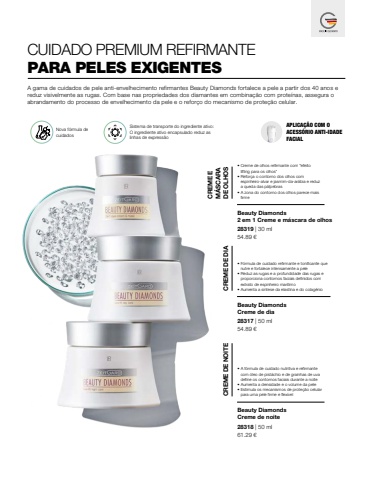 WIRKSTOFFTRANSPORTSYSTEMNEUE PFLEGE- FORMELN 54.89 %u20ac54.89 %u20ac61.29 %u20ac28319 | 30 ml28317 | 50 ml28318 | 50 mlAPLICA%u00c7%u00c3O COM O ACESS%u00d3RIO ANTI-IDADE FACIALSistema de transporte do ingrediente ativo:O ingrediente ativo encapsulado reduz as linhas de express%u00e3oNova f%u00f3rmula de cuidadosBeauty Diamonds2 em 1 Creme e m%u00e1scara de olhos%u2022 Creme de olhos refirmante com %u201cefeito lifting para os olhos%u201d%u2022 Refor%u00e7a o contorno dos olhos com espinheiro-alvar e jasmim-da-ar%u00e1bia e reduz a queda das p%u00e1lpebras%u2022 A zona do contorno dos olhos parece mais CREME E M%u00c1SCARA DE OLHOSfirmeBeauty DiamondsCreme de dia%u2022 F%u00f3rmula de cuidado refirmante e tonificante que nutre e fortalece intensamente a pele%u2022 Reduz as rugas e a profundidade das rugas e proporciona contornos faciais definidos com extrato de espinheiro mar%u00edtimo CREME DE DIA%u2022 Aumenta a s%u00edntese da elastina e do colag%u00e9nioBeauty DiamondsCreme de noite%u2022 A f%u00f3rmula de cuidado nutritiva e refirmante com %u00f3leo de pist%u00e1chio e de grainhas de uva define os contornos faciais durante a noite%u2022 Aumenta a densidade e o volume da pele%u2022 Estimula os mecanismos de prote%u00e7%u00e3o celular CREME DE NOITEpara uma pele firme e flex%u00edvelCUIDADO PREMIUM REFIRMANTE PARA PELES EXIGENTESA gama de cuidados de pele anti-envelhecimento refirmantes Beauty Diamonds fortalece a pele a partir dos 40 anos e reduz visivelmente as rugas. Com base nas propriedades dos diamantes em combina%u00e7%u00e3o com prote%u00ednas, assegura o abrandamento do processo de envelhecimento da pele e o refor%u00e7o do mecanismo de prote%u00e7%u00e3o celular.