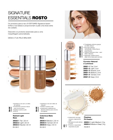 142 53612345665.39 %u20ac 65.39 %u20ac 49.99 %u20ac29022-1 29022-2 29022-3 29035-4 29035-5 29035-6 29023-1 29023-229021-129021-229021-329021-429021-529021-6SIGNATURE ESSENTIALS ROSTOOs produtos para a tez LR%u00a0ZEITGARD Signature fazem brilhar a tua beleza e proporcionam %u00e0 pele uma dose extra de cuidado. Descobre os produtos essenciais para a uma maquilhagem personalizada. DEIXA A TUA PELE BRILHAR!Radiant LightBase%u2022 Aperfei%u00e7oa a tez sem um efeito de m%u00e1scara%u2022 Acabamento luminoso natural para uma tez fresca%u2022 Hidrata e acalma a pele BASE%u2022 FPS 20Cobertura MateBase%u2022 Aperfei%u00e7oa a tez sem efeito de m%u00e1scara%u2022 Hidrata e acalma a pele%u2022 Acabamento matificante de elevada cobertura para uma tez BASEhomog%u00e9neaFlawlessP%u00f3 fixador%u2022 Acabamento de longa dura%u00e7%u00e3o e ligeiramente mate%u2022 Sensa%u00e7%u00e3o de pele sedosa e macia %u2022 Preserva a capacidade P%u00d3respirat%u00f3ria da peleFair | 32 mlLight | 32 mlNeutral | 32 mlMedium | 32 mlTanned | 32 mlDeep | 32 mlLight-Medium | 9 gMedium-Deep | 9 gCorretor Natural e Luminoso%u2022 Tonalidade uniforme gra%u00e7as ao efeito difusor%u2022 Esconde olheiras, vermelhid%u00e3o, linhas finas e imperfei%u00e7%u00f5es%u2022 Textura cremosa e leve%u00a0%u2013 sem efeito m%u00e1scara%u2022 Aplica%u00e7%u00e3o multifuncional%u00a0%u2013 CORRETORideal como base para sombraFair | 5ml Light | 5mlNeutral | 5mlMedium | 5mlTanned | 5mlDeep | 5mlDispon%u00edvel a partir dooutono de2025