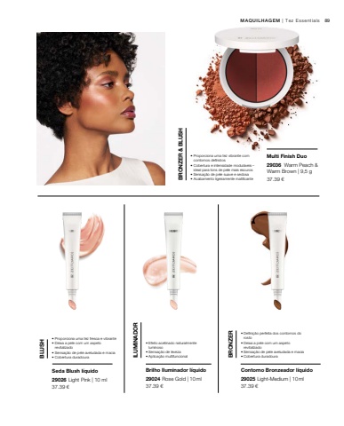 89 37.39 %u20ac 37.39 %u20ac 37.39 %u20ac37.39 %u20ac29026 29024 2902529036MAQUILHAGEM | Tez EssentialsSeda Blush l%u00edquido%u2022 Proporciona uma tez fresca e vibrante%u2022 Deixa a pele com um aspeto revitalizado%u2022 Sensa%u00e7%u00e3o de pele aveludada e macia BLUSH%u2022 Cobertura duradouraBrilho Iluminador l%u00edquido%u2022 Efeito acetinado naturalmente luminoso%u2022 Sensa%u00e7%u00e3o de leveza ILUMINADOR%u2022 Aplica%u00e7%u00e3o multifuncionalContorno Bronzeador l%u00edquido%u2022 Defini%u00e7%u00e3o perfeita dos contornos do rosto%u2022 Deixa a pele com um aspeto revitalizado%u2022 Sensa%u00e7%u00e3o de pele aveludada e macia BRONZER%u2022 Cobertura duradoura%u2022 Proporciona uma tez vibrante com Multi Finish Duocontornos definidos%u2022 Cobertura e intensidade modul%u00e1veis %u2013 ideal para tons de pele mais escuros%u2022 Sensa%u00e7%u00e3o de pele suave e sedosa BRONZER & BLUSH%u2022 Acabamento ligeiramente matificanteLight Pink | 10 ml Rose Gold | 10ml Light-Medium | 10ml Warm Peach &Warm Brown | 9,5 g