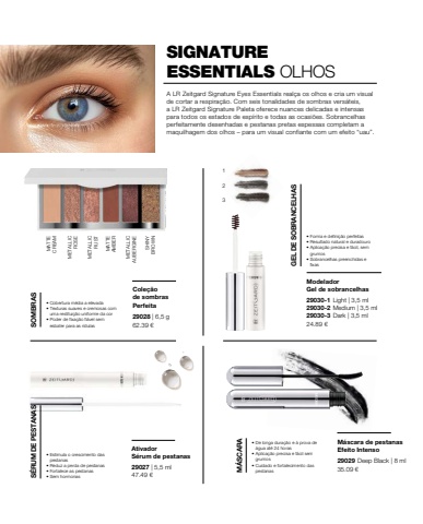 12362.39 %u20ac47.49 %u20ac35.09 %u20ac24.89 %u20ac29028 | 6,5 g29027 | 5,5 ml2902929030-1 29030-2 29030-3 MATTE CREAM METALLIC ROSE METALLIC RUST MATTE AMBER METALLIC AUBERGINE SHINY BROWNSIGNATURE ESSENTIALS OLHOSA LR%u00a0Zeitgard Signature Eyes Essentials real%u00e7a os olhos e cria um visual de cortar a respira%u00e7%u00e3o. Com seis tonalidades de sombras vers%u00e1teis, a LR%u00a0Zeitgard Signature Paleta oferece nuances delicadas e intensas para todos os estados de esp%u00edrito e todas as ocasi%u00f5es. Sobrancelhas perfeitamente desenhadas e pestanas pretas espessas completam a maquilhagem dos olhos %u2013 para um visual confiante com um efeito %u201cuau%u201d.Cole%u00e7%u00e3o de sombrasPerfeitaAtivadorS%u00e9rum de pestanas%u2022 Cobertura m%u00e9dia a elevada%u2022 Texturas suaves e cremosas com uma restitui%u00e7%u00e3o uniforme da cor%u2022 Poder de fixa%u00e7%u00e3o fi%u00e1vel sem SOMBRASesbater para as r%u00eddulas%u2022 Estimula o crescimento das pestanas%u2022 Reduz a perda de pestanas%u2022 Fortalece as pestanas S%u00c9RUM DE PESTANAS%u2022 Sem hormonasM%u00e1scara de pestanas Efeito Intenso%u2022 De longa dura%u00e7%u00e3o e %u00e0 prova de %u00e1gua at%u00e9 24 horas%u2022 Aplica%u00e7%u00e3o precisa e f%u00e1cil sem grumos%u2022 Cuidado e fortalecimento das M%u00c1SCARApestanasModeladorGel de sobrancelhas%u2022 Forma e defini%u00e7%u00e3o perfeitas%u2022 Resultado natural e duradouro%u2022 Aplica%u00e7%u00e3o precisa e f%u00e1cil, sem grumos%u2022 Sobrancelhas preenchidas e GEL DE SOBRANCELHASfixasLight | 3,5 mlMedium | 3,5 ml Dark | 3,5 ml Deep Black | 8 ml
