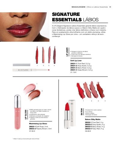 1 2 3 4121 2 3 491 37.39 %u20ac 49.99 %u20ac31.19 %u20ac29031-1 29031-2 29031-3 29031-4 29033-1 29033-2 29032-1 29032-2 29032-3 29032-4 MAQUILHAGEM | Olhos e L%u00e1bios EssentialsSIGNATURE ESSENTIALS L%u00c1BIOSA LR%u00a0Zeitgard Signature L%u00e1bios Essentials garante l%u00e1bios expressivos. Com o Delineador de l%u00e1bios suave e o Batom Silky Matte em quatro cores fant%u00e1sticas, podes criar l%u00e1bios definidos e cheios num instante. Para um acabamento ultra-brilhante com um efeito plumping, utiliza o Maximising Lip Gloss por cima %u2013 um verdadeiro refor%u00e7o da autoconfian%u00e7a!Soft Lip Liner%u2022 Assegura contornos de l%u00e1bios precisos e definidos%u2022 Cores ricas com elevada cobertura LIP LINER%u2022 Sensa%u00e7%u00e3o de levezaMaximising Lip Gloss%u2022 Efeito plumping para um maior volume dos l%u00e1bios com efeito imediato e a longo prazo%u2022 Acabamento ultra-brilhante%u2022 Estimula a produ%u00e7%u00e3o de colag%u00e9nio*%u2022 Hidrata e nutre as zonas secas e LIP GLOSSgretadas Batom Silky Matte%u2022 Acabamento mate e sedoso%u2022 Cor intensa %u2022 Nutre os l%u00e1bios BATOM%u2022 Sensa%u00e7%u00e3o de levezaPure Red | 0,2 gRosy Nude | 0,2 gBerry Rose | 0,2 gDeep Brown | 0,2 gPure Red | 4 gRosy Nude | 4 gBerry Rose | 4 gRuby Red | 4 gSoft Rose | 5mlPeachy Brown | 5ml * Utilizar 3 vezes por dia durante pelo menos 28 dias.