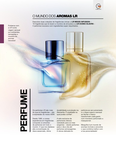 PERFUMEO MUNDO DOS AROMAS LRDescobre duas cole%u00e7%u00f5es de fragr%u00e2ncias %u00fanicas: a LR MOOD INFUSION%u00a0%u2013 18 fragr%u00e2ncias que te levam a mundos de emo%u00e7%u00f5es e a LR ICONIC ELIXIRS%u00a0%u2013 Embarca com 4 perfumes luxuosos com ingredientes super requintados.a LR numa viagem sensual por ambientes, sensa%u00e7%u00f5es e mundos de aromas luxuosos!Os perfumes LR s%u00e3o mais do que s%u00f3 fragr%u00e2ncias%u00a0%u2013 s%u00e3o a express%u00e3o do nosso ADN!Desde 1985, a nossa experi%u00eancia em fragr%u00e2ncias conquista os amantes de perfumes em todo o mundo. O que nos destaca: alta concentra%u00e7%u00e3o de %u00f3leos essenciais, %u00f3tima durabilidade e produ%u00e7%u00e3o na Alemanha. %u00c9 qualidade na qual podes confiar!A arte exclusiva da perfumaria oferece variedade para os mais exigentes%u00a0%u2013 desde perfumes para o dia a dia at%u00e9 perfumes extravagantes. A n%u00e9voa delicada do perfume ao ser pulverizado e o clique suave e sensual ao fechar o frasco transformam cada gesto num momento perfumado e inesquec%u00edvel.Mergulha num mundo de aromas incr%u00edveis e encontra o que combina melhor com a tua personalidade!