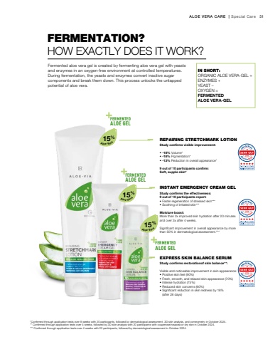 FERMENTEDALOE GELFERMENTEDALOE GELFERMENTEDALOE GELFERMENTEDALOE GELEYECREAMREFININGFERMENTEDALOE GELFERMENTEDALOE GEL15% ALOE VERA GEL INSIDEEMERGENCYCREAM GELINSTANT5 Pt5,5 PtStandardgr%u00f6%u00dfe >>> 6 Pt8 PtFERMENTEDALOE GELFERMENTEDALOE GELFERMENTEDALOE GELFERMENTEDALOE GELWith 50% aloe vera+fermented aloe gel& bio olive extractMoisturises & reduces fine linesEYE CREAMREFININGFERMENTEDALOE GELFERMENTEDALOE GEL5% ALOE VERA GEL INSIDE fermented aloe gel, micro algae extract & ermented reishiupports fast skin egeneration & estores skin balanceEMERGENCYCREAM GELNSTANT5 Pt5,5 PtStandardgr%u00f6%u00dfe >>> 6 Pt8 PtFERMENTEDALOE GELFERMENTEDALOE GELFERMENTEDALOE GELFERMENTEDALOE GEL5 Pt5,5 PtStandardgr%u00f6%u00dfe >>> 6 Pt8 Pt15%15%15%51 IN SHORT:ORGANIC ALOE VERA-GEL +ENZYMES +YEAST %u2013 OXYGEN =FERMENTEDALOE VERA-GELFermented aloe vera gel is created by fermenting aloe vera gel with yeasts and enzymes in an oxygen-free environment at controlled temperatures. During fermentation, the yeasts and enzymes convert inactive sugar components and break them down. This process unlocks the untapped potential of aloe vera.FERMENTATION?HOW EXACTLY DOES IT WORK?REPAIRING STRETCHMARK LOTION*Confirmed through application tests over 8 weeks with 20 participants, followed by dermatological assessment, 3D skin analysis, and corneometry in October 2024.** Confirmed through application tests over 4 weeks, followed by 3D skin analysis with 20 participants with couperose/rosacea or dry skin in October 2024.*** Confirmed through application tests over 4 weeks with 20 participants, followed by dermatological assessment in October 2024.Aloe VeraAloe VeraALOE VERA CARE | Special CareAloe VeraStudy confirms visible improvement:%u2022 -18% Volume*%u2022 -18% Pigmentation*%u2022 -13% Reduction in overall appearance*9 out of 10 participants confirm:Soft, supple skin*INSTANT EMERGENCY CREAM GELStudy confirms the effectiveness:9 out of 10 participants report: %u2022 Faster regeneration of stressed skin***%u2022 Soothing of irritated skin*** Moisture boost:More than 2x improved skin hydration after 20 minutesand over 3x after 4 weeks.Significant improvement in overall appearance by more than 50% in dermatological assessment.***EXPRESS SKIN BALANCE SERUM Study confirms restorationof skin balance**: Visible and noticeable improvement in skin appearance:%u2022 Positive skin feel (90%)%u2022 Fresh, smooth, and relaxed skin appearance (70%)%u2022 Intense hydration (75%)%u2022 Reduced skin concerns (60%)%u2022 Significant reduction in skin redness by 18% (after 28 days)