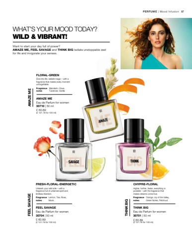 87 %u00a3 60.89(%u00a3 121.78 for 100 ml)30704 | 50 ml%u00a3 60.89(%u00a3 121.78 for 100 ml)30701 | 50 ml%u00a3 60.89(%u00a3 121.78 for 100 ml)30710 | 50 mlWHAT%u2019S YOUR MOOD TODAY?WILD & VIBRANT!Want to start your day full of power?AMAZE ME, FEEL SAVAGE and THINK BIG radiate unstoppable zest for life and invigorate your senses.PERFUME | Mood InfusionFragrance notesDive into life, radiate magic %u2013 with a fragrance that makes every moment unforgettable.FLORAL-GREENMandarin, Clove, Tuberose, VanillaAMAZE MEEau de Parfum for women AMAZE MEFragrance notesUnleash your wild side %u2013 with a fragrance full of untamed spirit and limitless freedom.FRESH-FLORAL-ENERGETICLemon, Tea, Rose, MuskFEEL SAVAGEEau de Parfum for women FEEL SAVAGEFragrance notesHigher, further, faster, everything is possible %u2013 with the fragrance that makes dreams come true.CHYPRE-FLORALOrange, Lily of the Valley, Green Notes, PatchouliTHINK BIGEau de Parfum for women THINK BIG