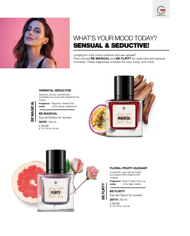 %u00a3 60.89(%u00a3 121.78 for 100 ml)30707 | 50 ml%u00a3 60.89(%u00a3 121.78 for 100 ml)30714 | 50 mlWHAT%u2019S YOUR MOOD TODAY?SENSUAL & SEDUCTIVE!Longing for a bit more romance and sex appeal?Then choose BE MAGICAL and BE FLIRTY for seductive and sensual moments. These fragrances enchant the soul, body, and mind.Fragrance notesSeductive, sensual, sophisticated %u2013 accentuate your mood with a fragrance that tempts.ORIENTAL-SEDUCTIVEBergamot, Passion Fruit, Cotton Candy, CedarwoodBE MAGICALEau de Parfum for women BE MAGICALFragrance notesA subtle flirt, a play with fire? Ignite your passion with a fragrance full of desire.FLORAL-FRUITY-ELEGANTBlood Orange, Rose, Lily of the Valley, VetiverBE FLIRTYEau de Parfum for women BE FLIRTY