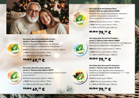 89,78 %u20ac 79,99 %u20ac89,78 %u20ac 79,99 %u20ac89,78 %u20ac 79,99 %u20ac77,98 %u20ac 69,99 %u20ac77,98 %u20ac 69,99 %u20ac2 x 1000 ml (39,99 %u20ac pour 100 ml)2 x 1000 ml (39,99 %u20ac pour 1000 ml2 x 1000 ml (39,99 %u20ac pour 100 ml)2 x 1000 ml (34,99 %u20ac pour 1000 ml2 x 1000 ml (34,99 %u20ac pour 1000 mlGarantit un bon %u00e9quilibre %u00e9lectrolytique et renforce le m%u00e9tabolisme %u00e9nerg%u00e9tique 3,10,11,12 tout au long de l%u2019ann%u00e9e.81100 Gel %u00e0 boire a%u00e7a%u00ef*| 1000ml+ 20603 Thermo Lotion offerte | 100mlGel %u00e0 boire Aloe Vera a%u00e7a%u00ef Pro Summer*, set de 2 + Thermo Lotion offerte |%u00a081102Renforce les cartilages et la fonction cartilagineuse ainsi que le m%u00e9tabolisme %u00e9nerg%u00e9tique. 3,8,980850 Gel %u00e0 boire Active Freedom* | 1000ml+ 20603 Thermo Lotion offerte | 100mlGel %u00e0 boire Aloe Vera Active Freedom*,set de 2 + Thermo Lotion offerte |%u00a080868Renforce les cellules immunitaires, stimule le syst%u00e8me immunitaire et soutient le fonctionnement du syst%u00e8me immunitaire. 1,281000 Gel %u00e0 boire Immune Plus* | 1000ml+ 20603 Thermo Lotion offerte | 100mlGel %u00e0 boire Aloe Vera Immune Plus*,set de 2 + Thermo Lotion offerte |%u00a081002Renforce le m%u00e9tabolisme %u00e9nerg%u00e9tique3 et ne contient aucun sucre.**80750 Gel %u00e0 boire saveur p%u00eache* | 1000ml+ 20603 Thermo Lotion offerte | 100mlGel %u00e0 boire Aloe Vera saveur p%u00eache*, set de 2 + Thermo Lotion offerte |%u00a080779Favorise les apports g%u00e9n%u00e9raux, les d%u00e9fenses immunitaires et le m%u00e9tabolisme %u00e9nerg%u00e9tique.3,4,580700 Gel %u00e0 boire Aloe Vera traditionnel au miel* | 1000ml+ 20603 Thermo Lotion offerte | 100mlGel %u00e0 boire Aloe Vera traditionnel au miel*,set de 2 + Thermo Lotion offerte |%u00a080702I 19