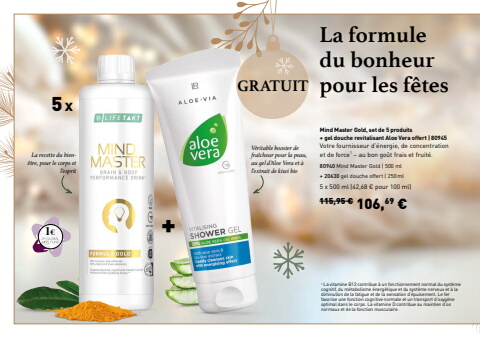 +5x115,95 %u20ac 106,69 %u20ac5 x 500 ml (42,68 %u20ac pour 100 ml)1%u20ac80940 Mind Master Gold |%u00a0500 ml + 20630 gel douche offert | 250mlVotre fournisseur d%u2019%u00e9nergie, de concentration et de force1 %u2013 au bon go%u00fbt frais et fruit%u00e9.Mind Master Gold, set de 5 produits+ gel douche revitalisant Aloe Vera offert | 80945La formuledu bonheur GRATUIT pour les f%u00eatesV%u00e9ritable booster de fra%u00eecheur pour la peau, au gel d%u2019Aloe Vera et %u00e0 l%u2019extrait de kiwi bioLa recette du bien%u00eatre, pour le corps et l%u2019esprit1 La vitamine B12 contribue %u00e0 un fonctionnement normal du syst%u00e8me cognitif, du m%u00e9tabolisme %u00e9nerg%u00e9tique et du syst%u00e8me nerveux et %u00e0 la diminution de la fatigue et de la sensation d%u2019%u00e9puisement. Le fer favorise une fonction cognitive normale et un transport d%u2019oxyg%u00e8ne optimal dans le corps. La vitamine D contribue au maintien d%u2019os normaux et de la fonction musculaire.